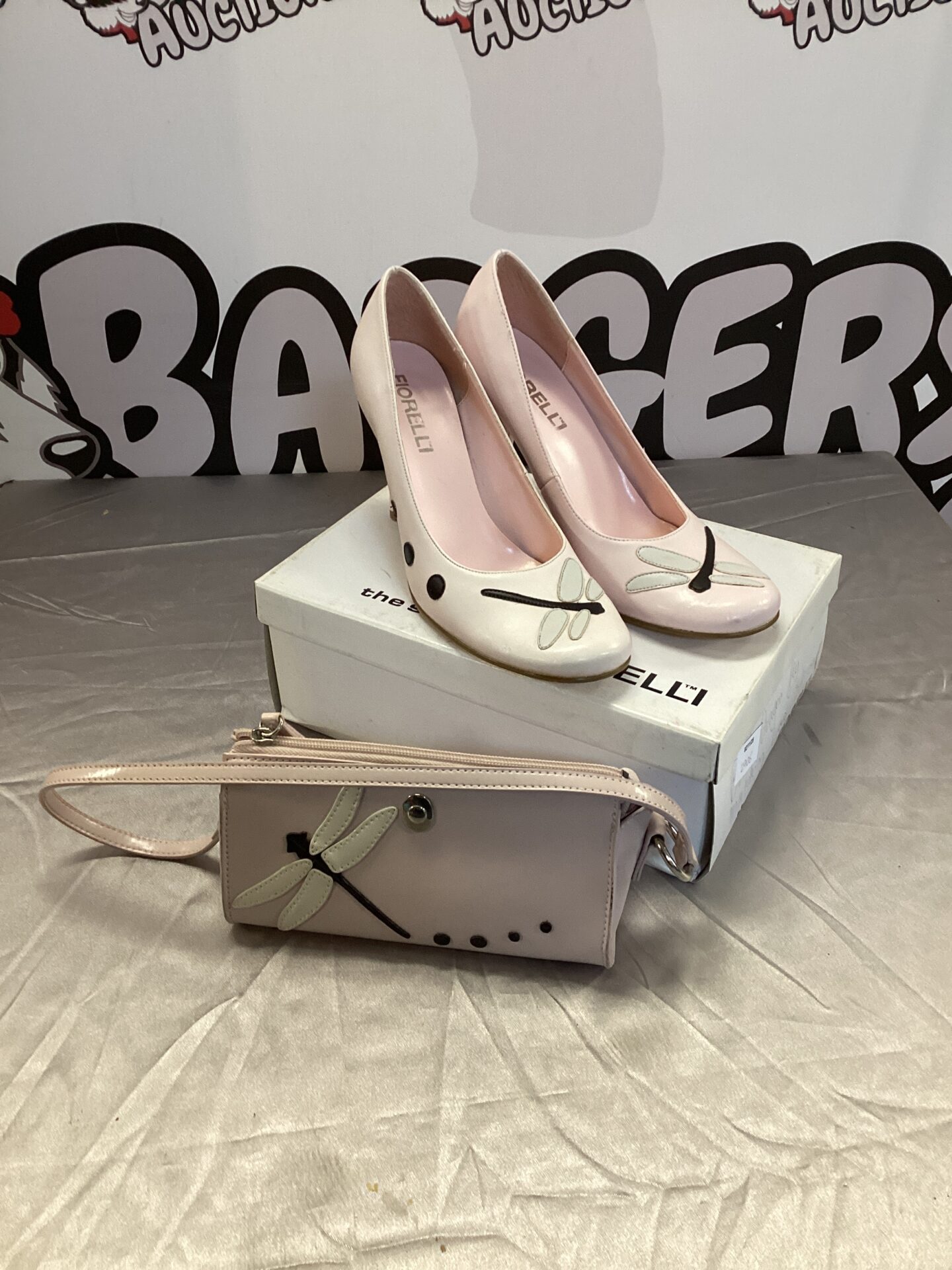 This charming set includes a Fiorelli handbag and matching shoes, both adorned with a delicate dragonfly motif. The set is crafted from a pink material, offering a feminine and stylish aesthetic. The handbag features a secure closure and ample space for essentials, while the shoes provide both comfort and elegance.