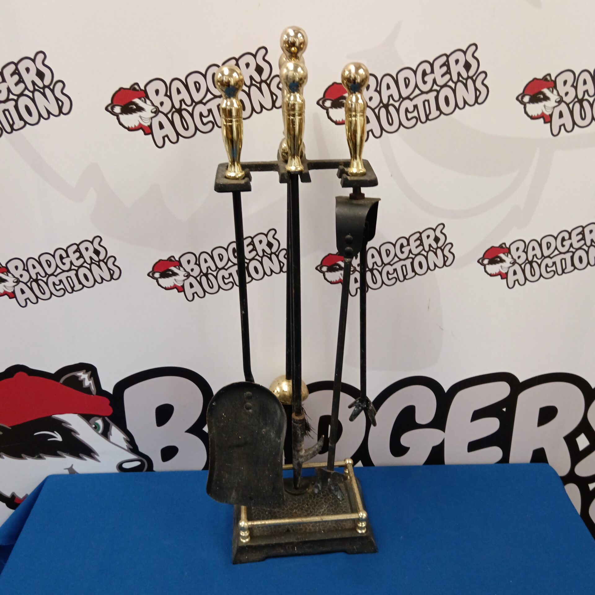 This fireplace companion set is in good vintage condition, showing signs of wear consistent with age and use. The iron exhibits some patina, while the brass retains a lovely sheen. This set would be a welcome addition to any collection of antique fireplace accessories, or a charming functional piece for a cozy home. It’s a testament to quality craftsmanship and timeless design.
