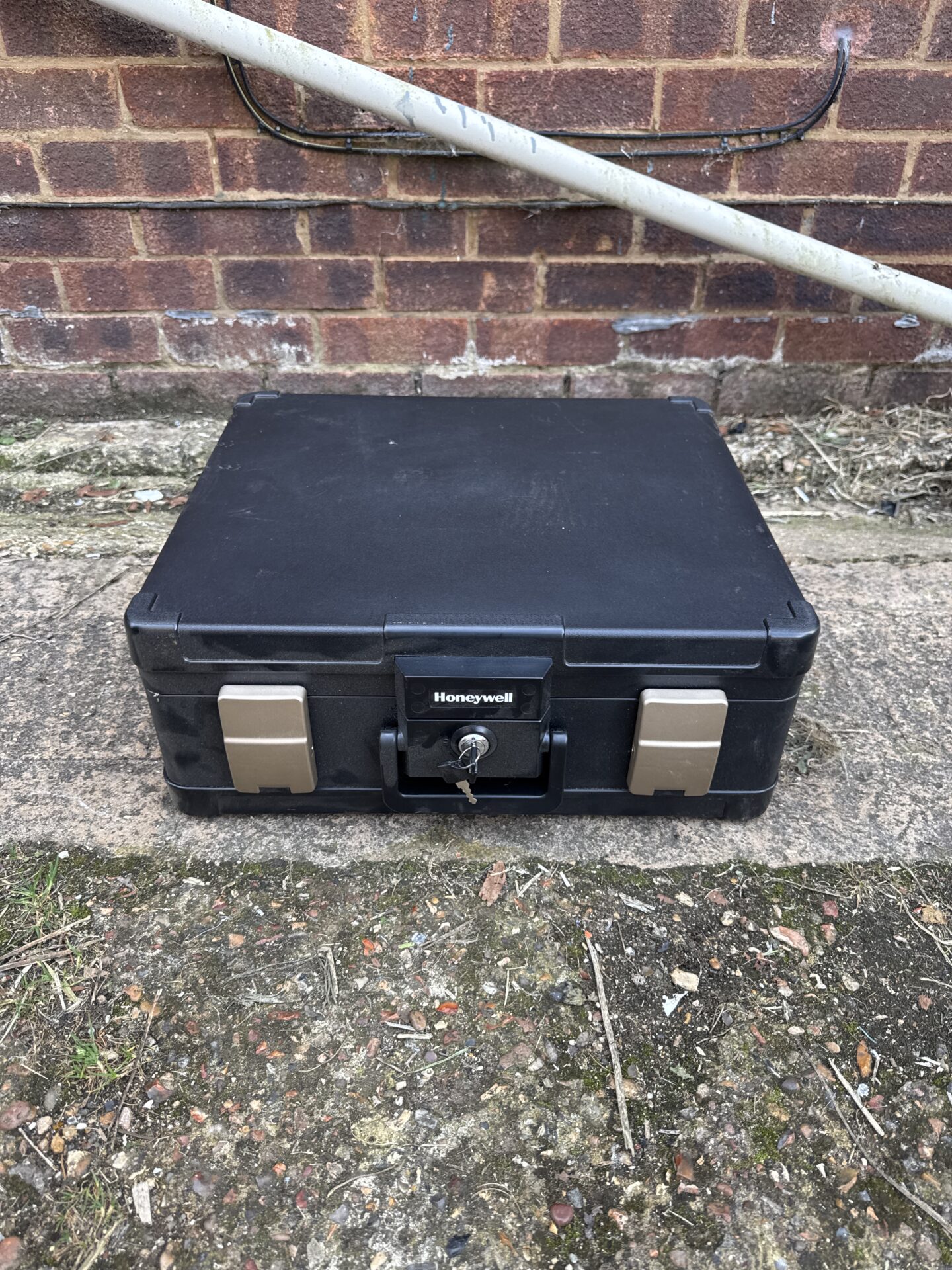 This is a heavy-duty Honeywell firesafe document box, designed for the secure storage of important papers and valuables. The box features a robust construction, intended to protect contents from fire damage. It is equipped with a key lock mechanism for added security, and a carrying handle for portability.