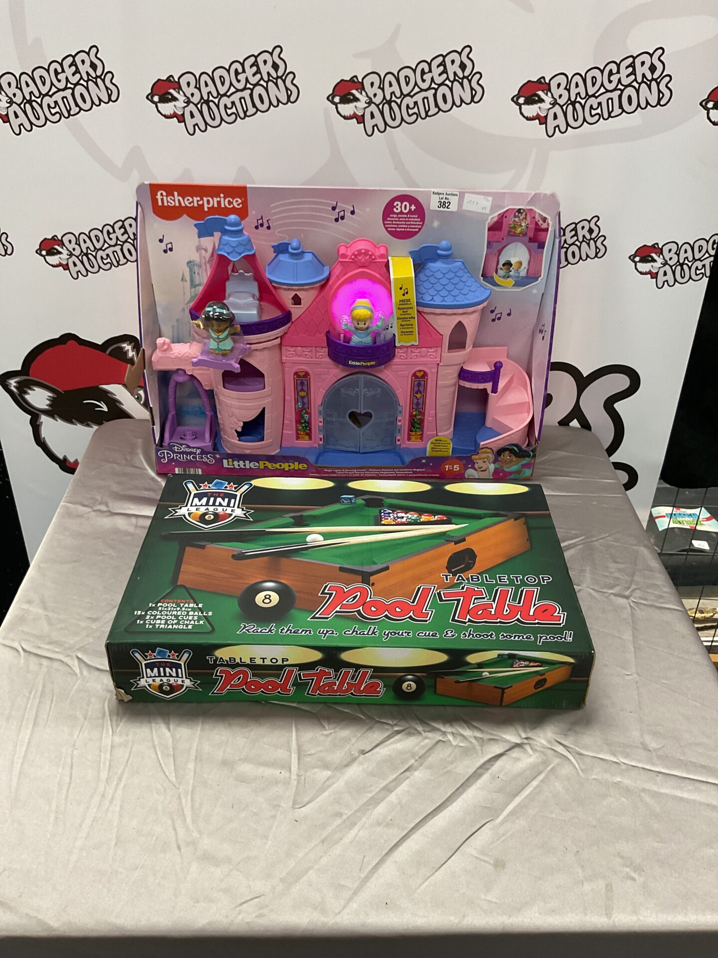 This delightful Fisher Price Disney Princess Little People playset offers a whimsical world of fun for young imaginations. Featuring a miniature pool table and charming Disney Princess figures, this set encourages interactive play and storytelling. The set is designed with bright colours and child-friendly features, making it perfect for little hands and fostering creativity. This particular playset is model number 382.