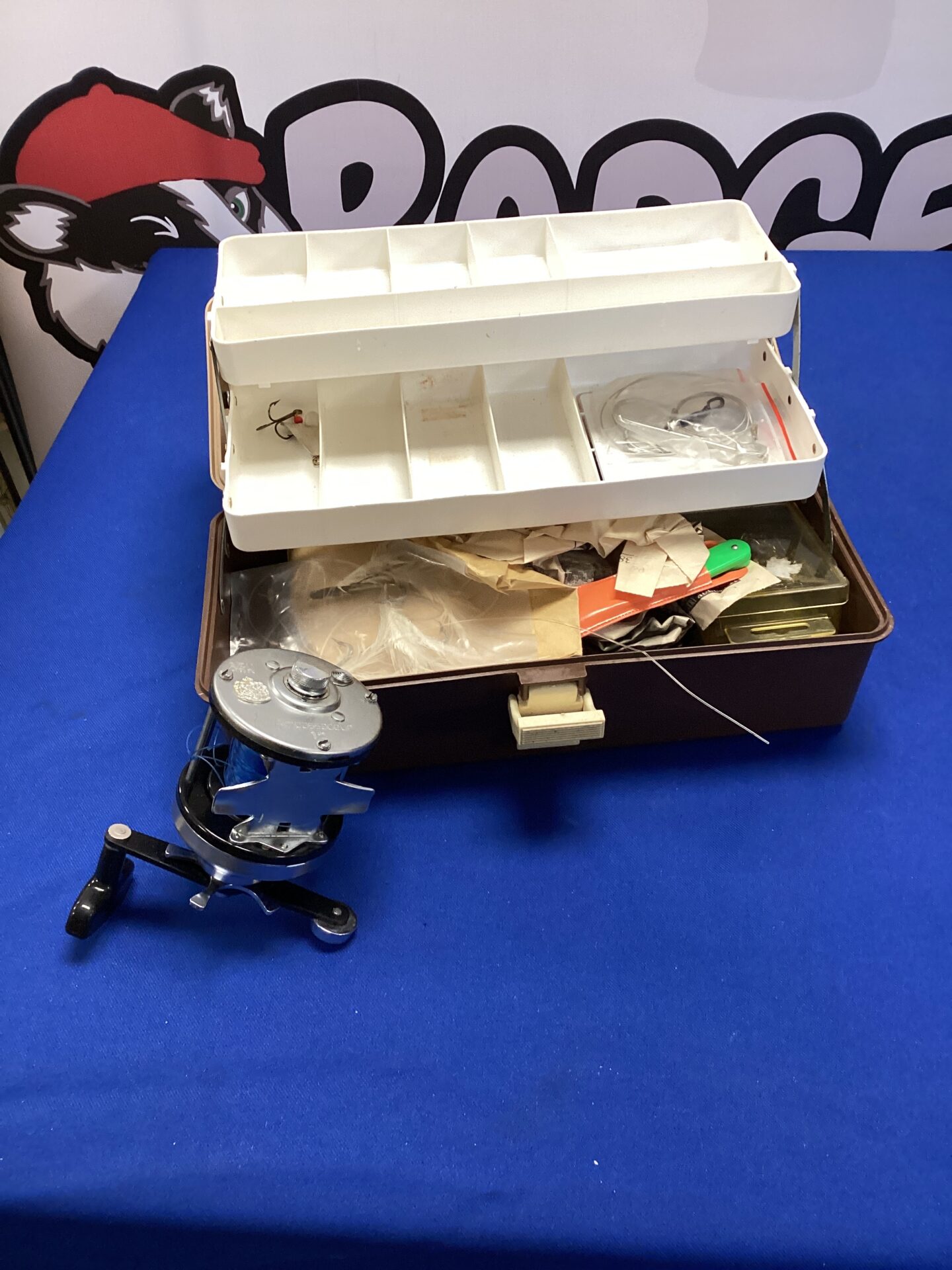 The tackle box and its contents exhibit signs of use and age, consistent with vintage items. The reel shows wear, but appears largely intact. This lot would appeal to collectors of vintage fishing equipment, anglers seeking classic gear, or those looking for a nostalgic piece of outdoor history.