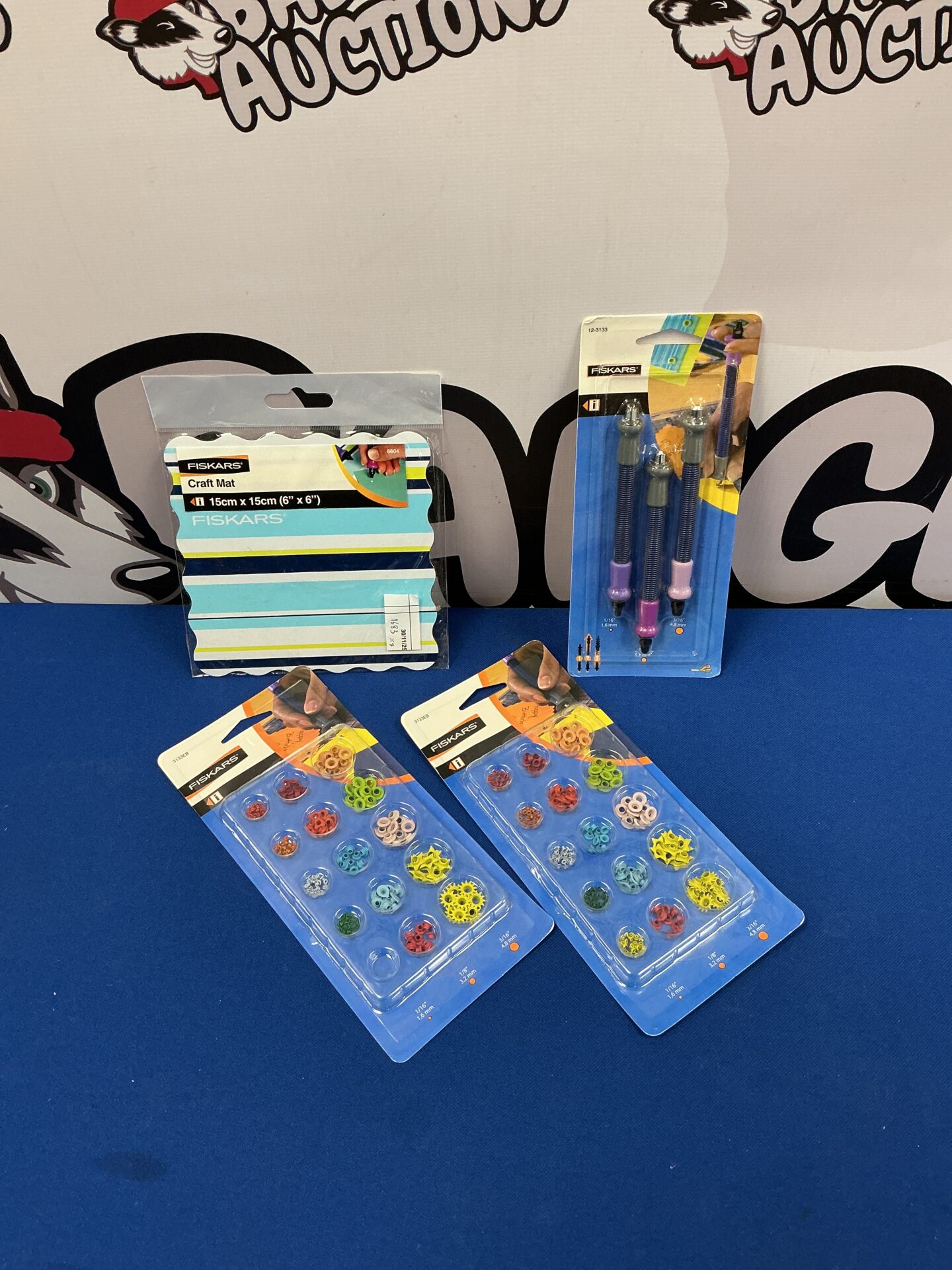 This bundle features a selection of Fiskars crafting tools, ideal for paper crafting and DIY projects. The set includes various punches for creating decorative shapes, a craft mat to protect work surfaces, and eyelets for adding finishing touches to projects. This collection offers versatility for a range of creative endeavors.