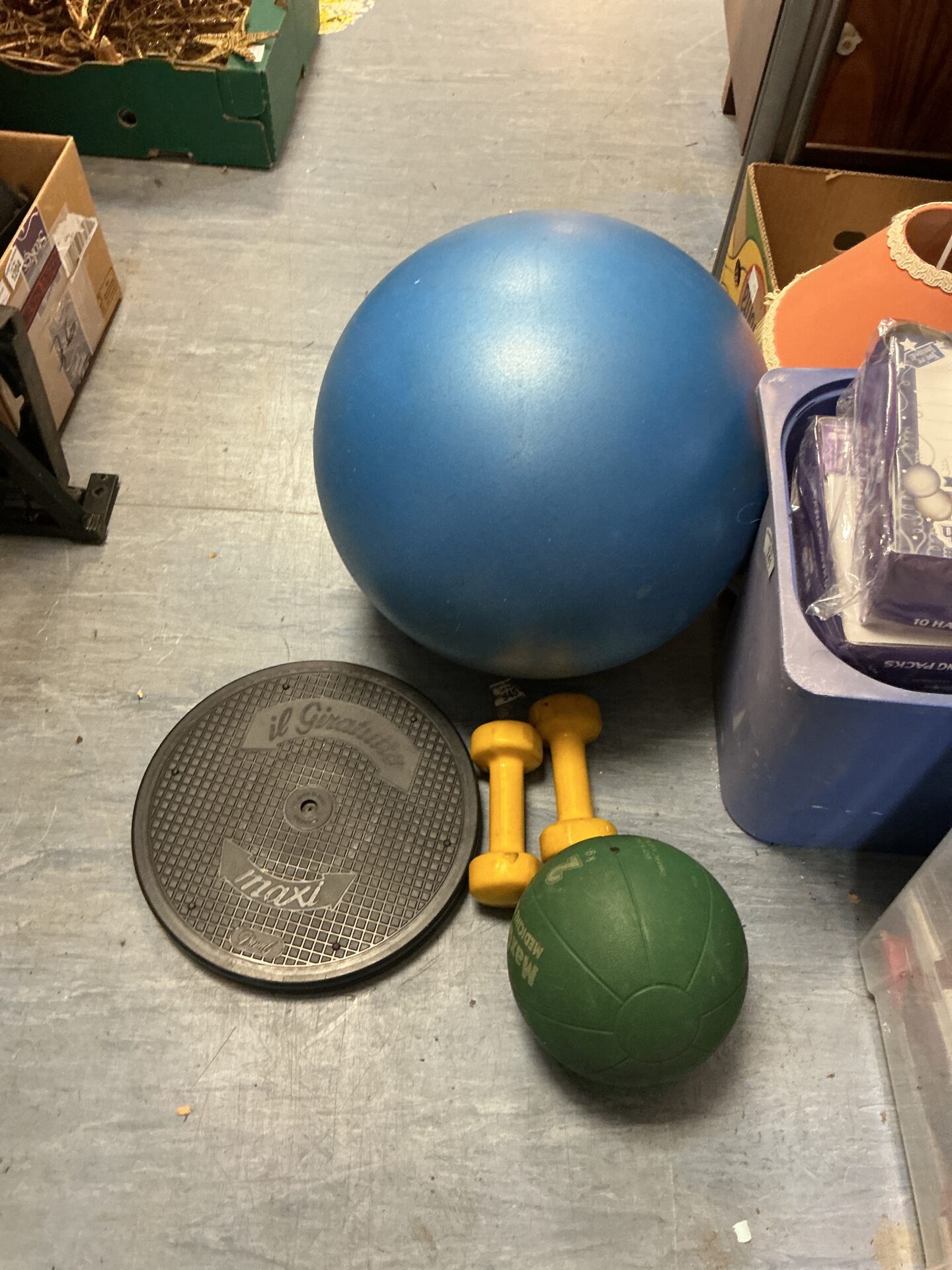 This lot comprises a selection of fitness equipment for home use. It includes a circular weight plate, a blue exercise ball, and a pair of dumbbells. These items are designed to facilitate a range of exercises, from strength training to core work and flexibility.
