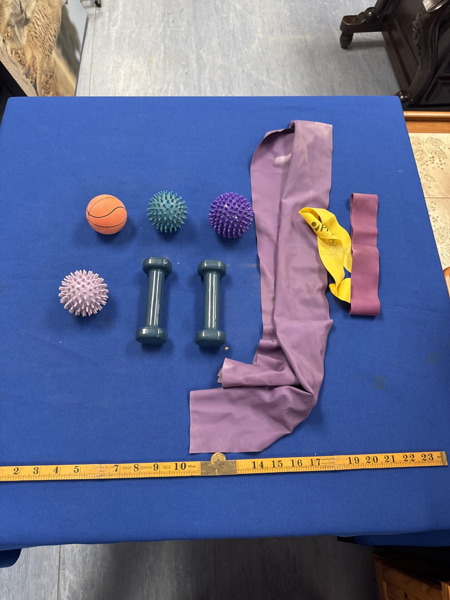 This lot comprises a variety of fitness equipment ideal for home workouts or rehabilitation. It includes a pair of small dumbbells, perfect for toning and strength training, a textured exercise ball for core work and flexibility, and several resistance bands offering varying levels of intensity. This collection provides a versatile range of options for a full-body workout, catering to different fitness levels and preferences.