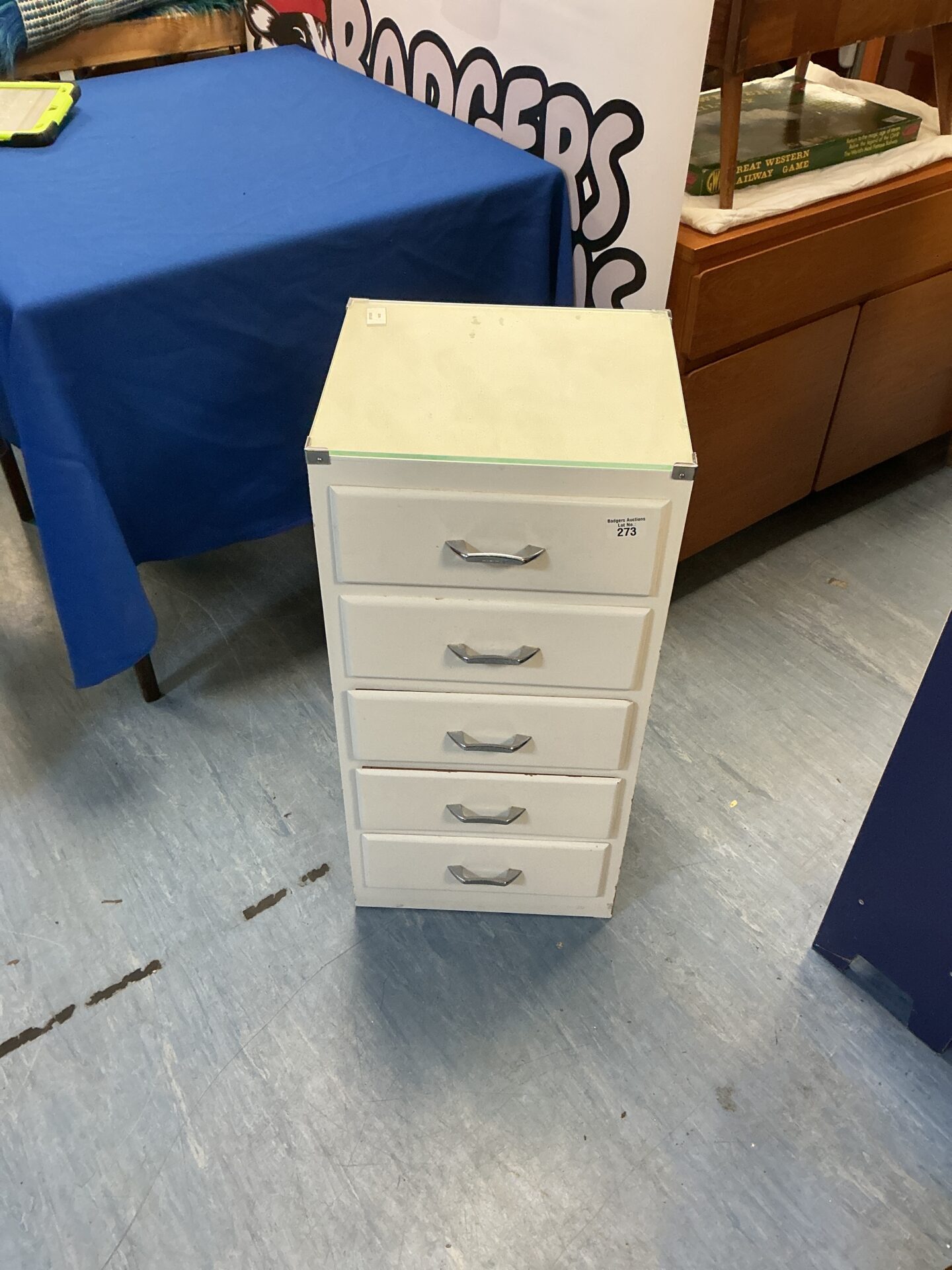 This is a small, five-drawer unit, likely intended for office or workshop storage. The unit appears to be constructed from a painted material, possibly wood or a composite, and features a simple, functional design. Its compact size makes it suitable for smaller spaces, and the multiple drawers offer organised storage for various items.