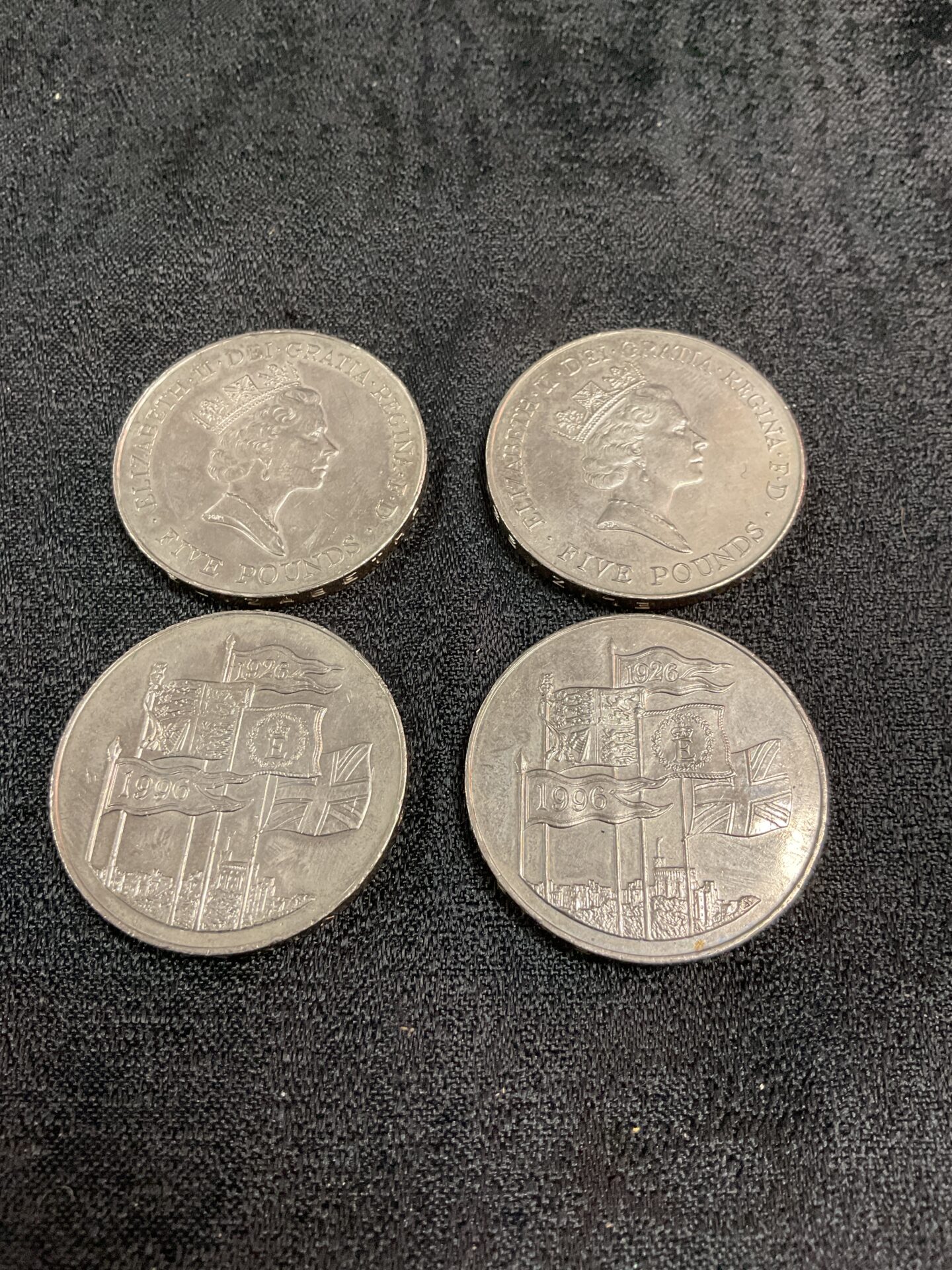 This lot features four Five Pound coins from the United Kingdom, issued by the Royal Mint. These circulating coins showcase unique designs and are popular with collectors. A great addition to any numismatic collection or for those interested in British currency.