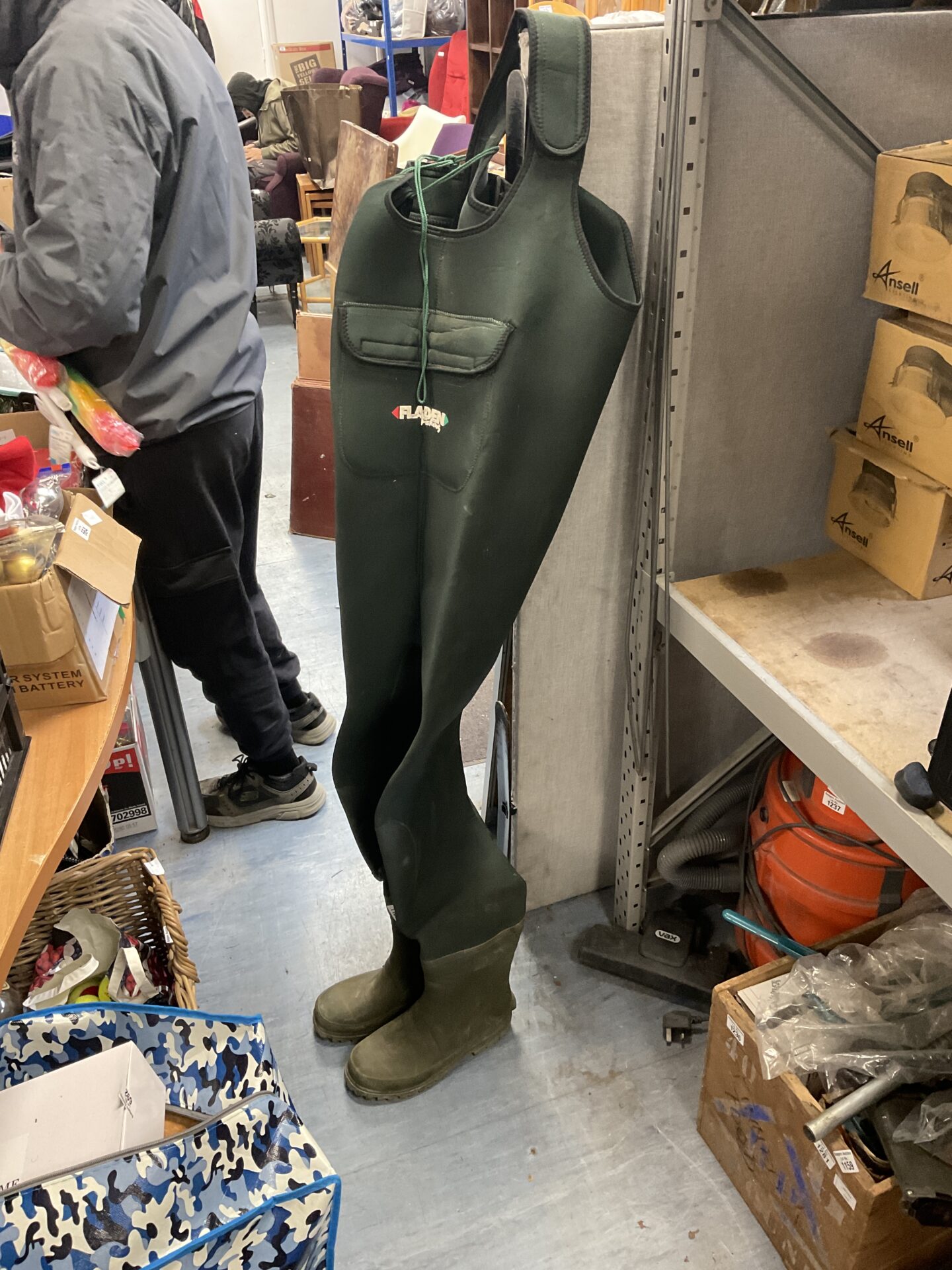 These Fladen fishing waders are size 43 and designed to keep you dry while angling. Constructed from a durable waterproof material, they are ideal for freshwater fishing. Offered as seen, these waders show signs of previous use and are suitable for anglers or collectors.