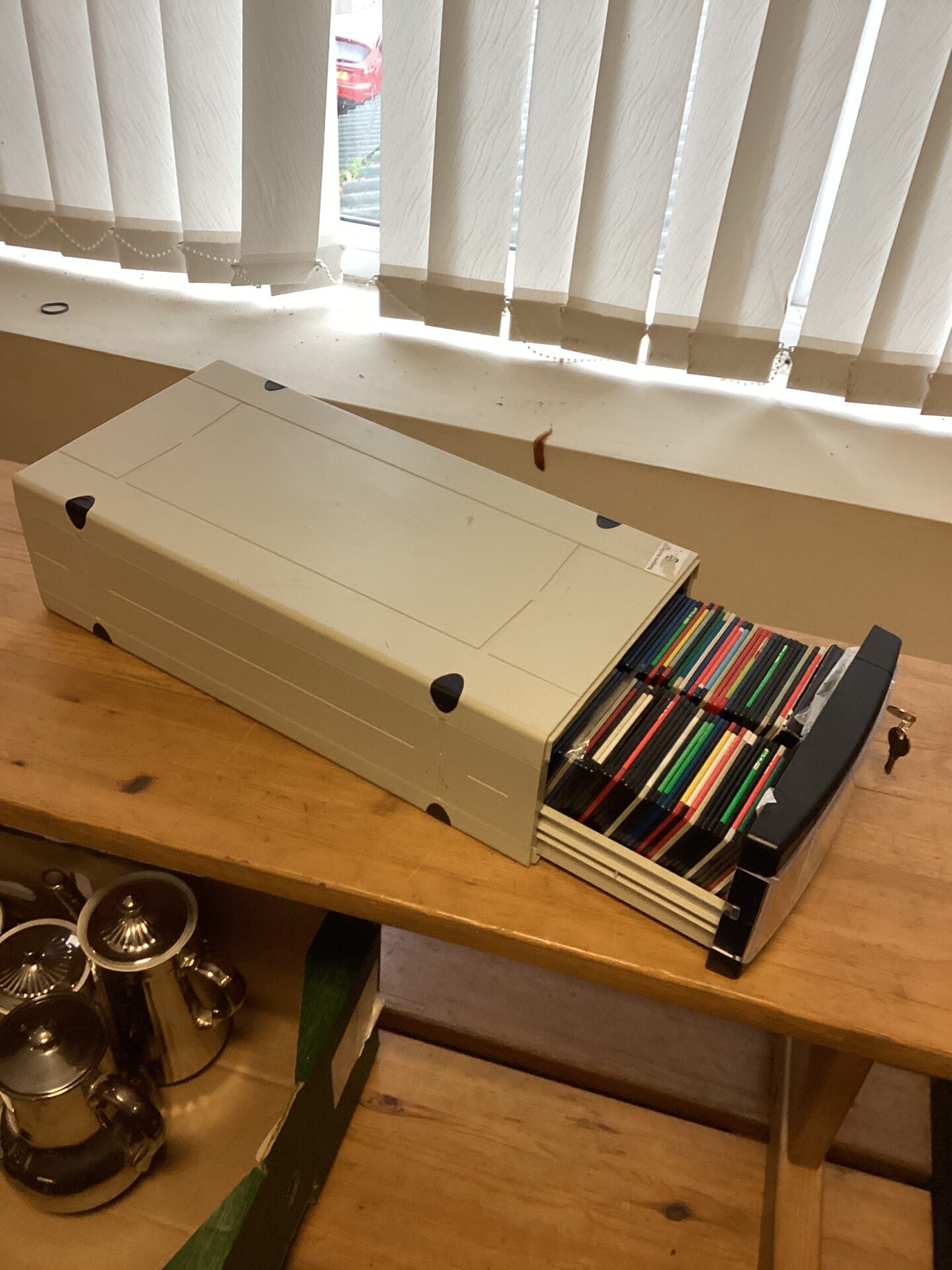 This is a plastic storage case designed to hold 3.5 inch floppy disks. The case features a dark grey exterior and a sliding internal tray system to organise and protect the disks. It’s a practical accessory for anyone who still has a collection of these vintage storage media, or for collectors of retro computer technology.