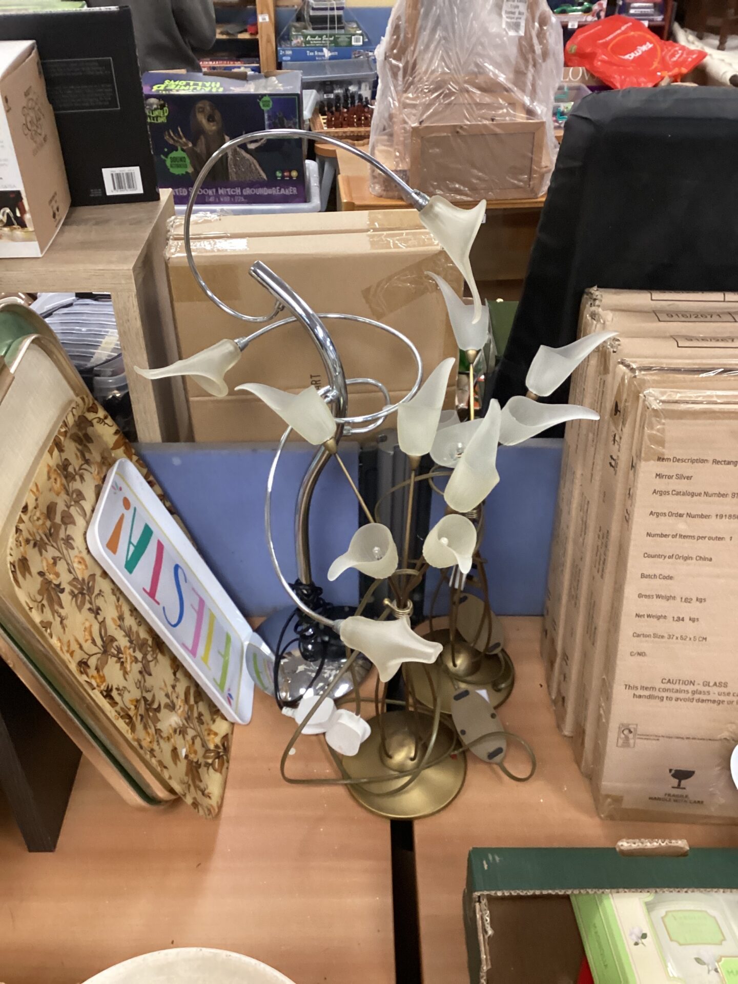 This lot comprises three decorative table lamps, each featuring a unique floral-inspired design. The lamps showcase a delicate arrangement of metal ‘petals’ and leaves, creating a visually appealing and elegant aesthetic. These lamps are designed to add a touch of sophistication to any room, providing both functional lighting and a beautiful decorative element.
