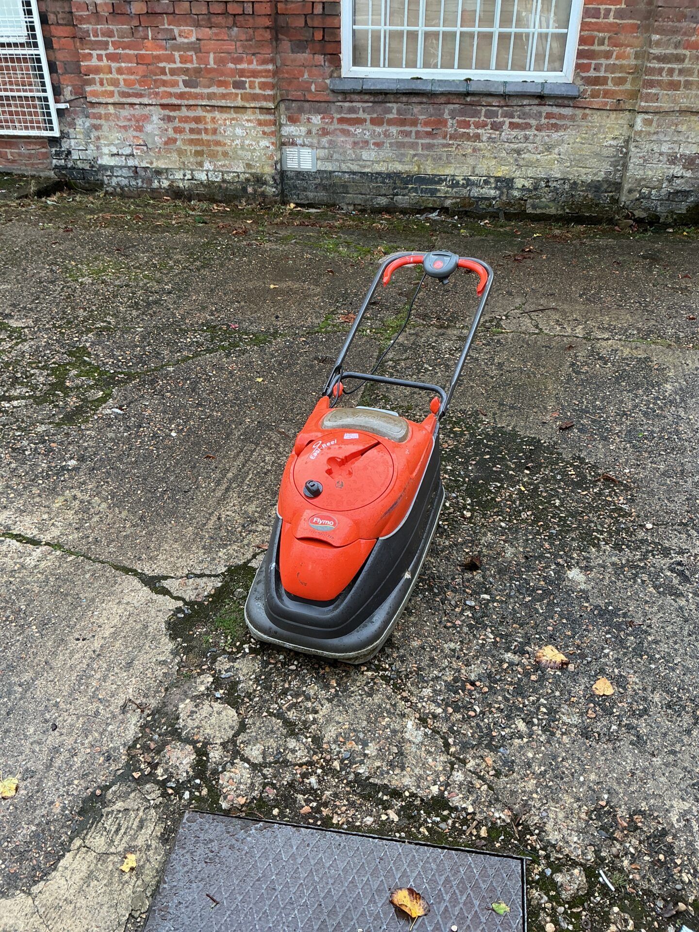 This is a Flymo electric lawnmower, designed for maintaining smaller gardens with ease. The mower features a lightweight construction and an electric motor, making it a convenient alternative to petrol-powered models. Its simple design and ease of use have made Flymo mowers a popular choice for home gardeners for many years.