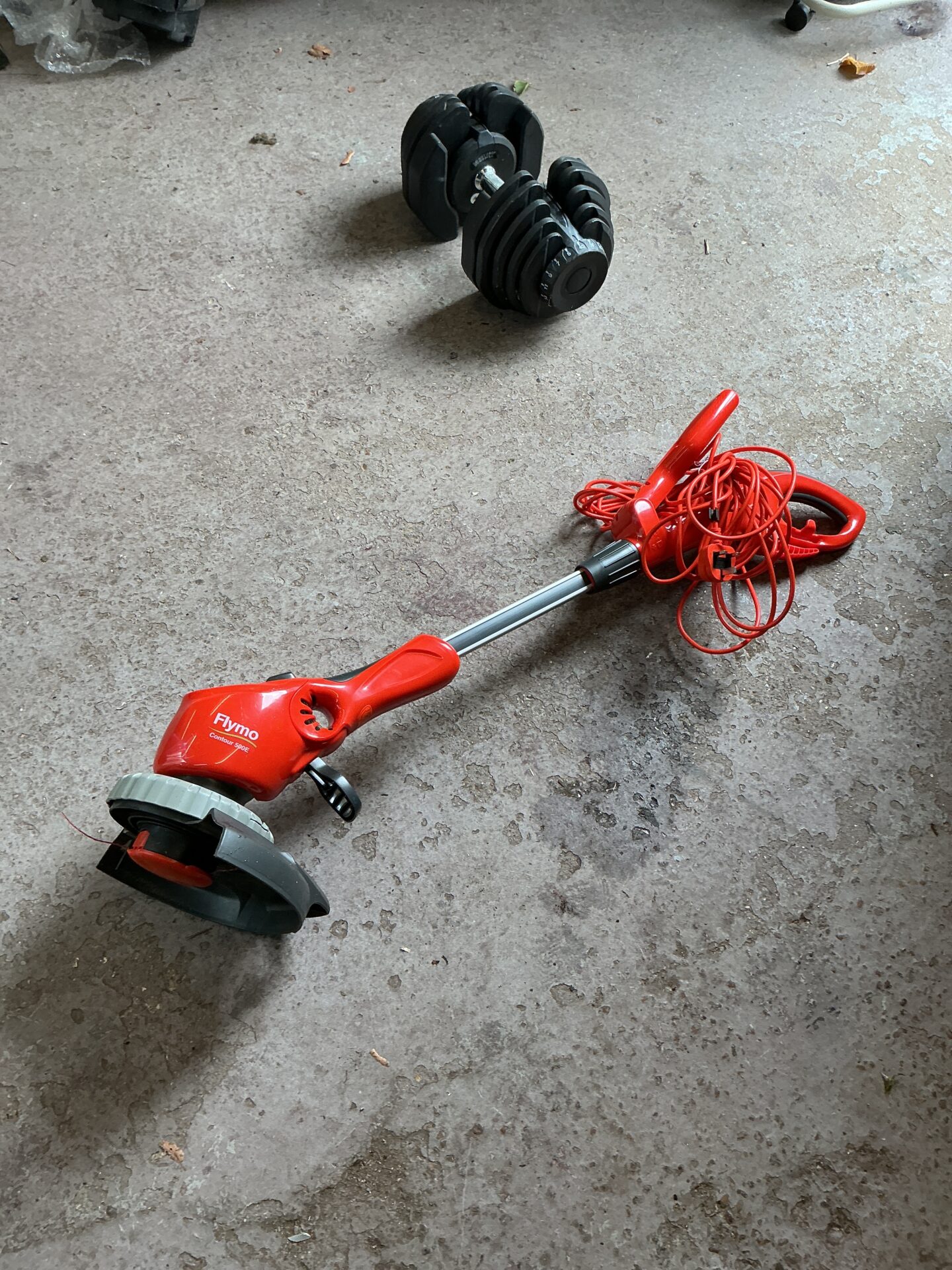 This Flymo Contour 500E strimmer is presented for consideration by a collector or user. Please examine the images carefully to assess its condition. It may be of interest to those seeking vintage garden tools or a functional strimmer for light-duty tasks.