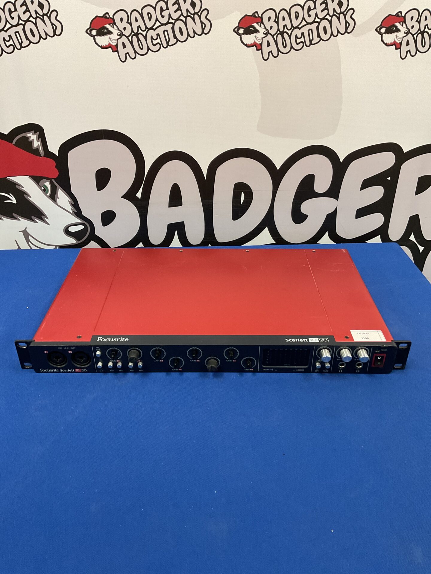 This Focusrite Scarlett 18i20 appears to be in good condition, showing signs of normal use. It is a highly sought-after interface known for its reliability and excellent sound quality. This unit would be a valuable addition to any recording setup or a great find for collectors of professional audio equipment.