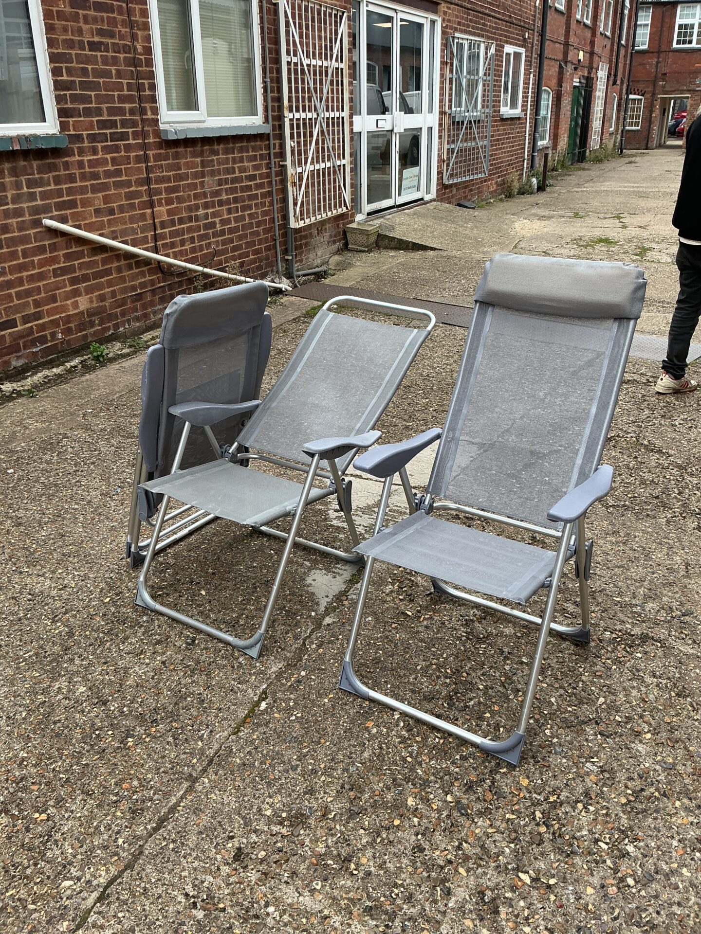 This lot comprises three folding garden chairs, ideal for patio, balcony, or camping use. Constructed with lightweight aluminium frames and durable fabric seats and backs, these chairs offer both comfort and portability. Their folding design allows for easy storage and transportation, making them a practical choice for those with limited space or who enjoy outdoor activities.