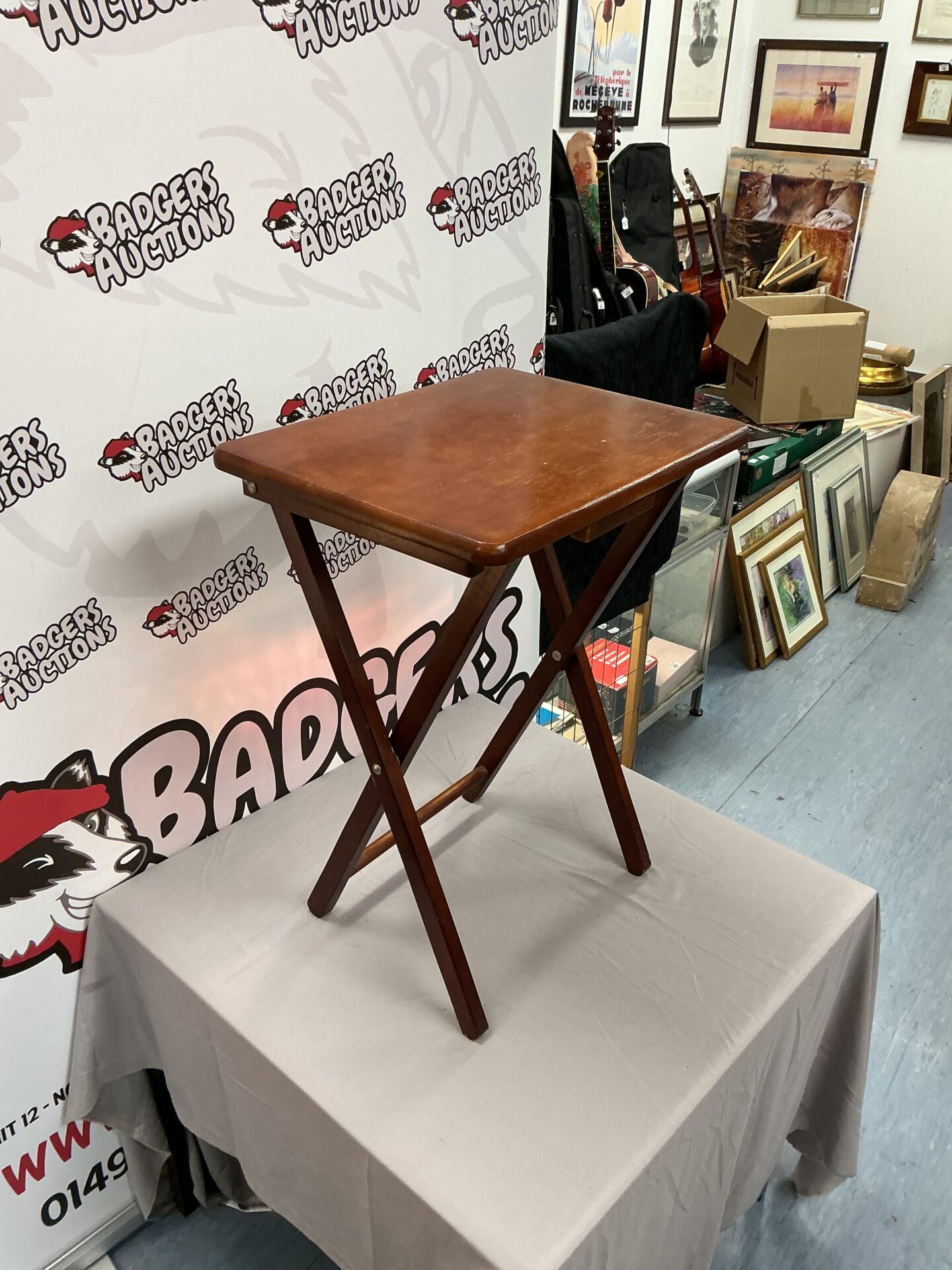 This is a charming, dark wood folding side table, perfect for small spaces or as an extra surface when needed. The table features a simple, classic design with sturdy legs that fold flat for easy storage. Its compact size makes it ideal for use as a bedside table, a plant stand, or a convenient surface for drinks and snacks.