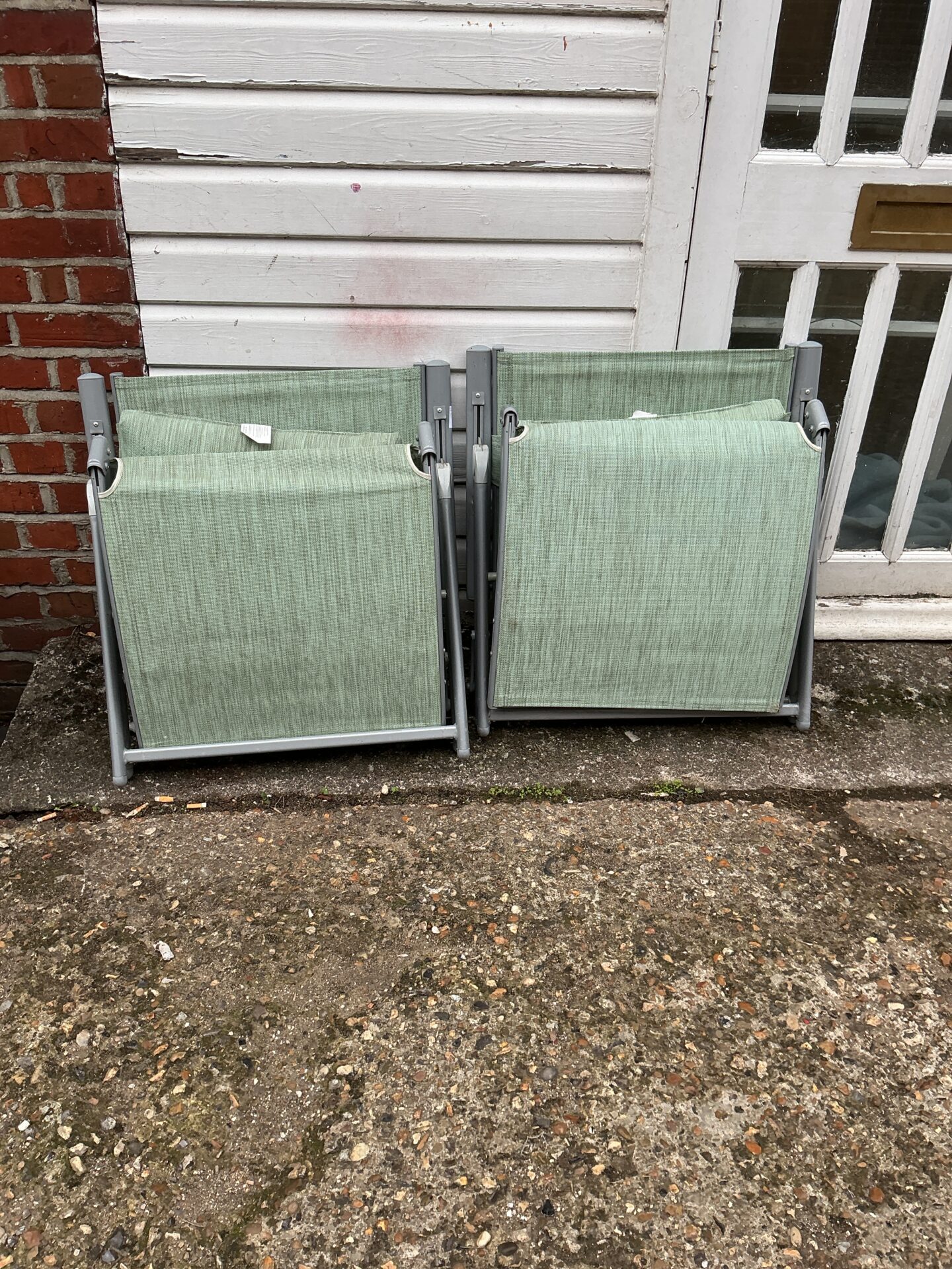 This lot includes two folding sun lounges, perfect for garden relaxation or camping trips. Featuring green striped fabric and lightweight metal frames, these chairs fold flat for easy storage and transport. They show signs of wear consistent with age, offering a vintage aesthetic.