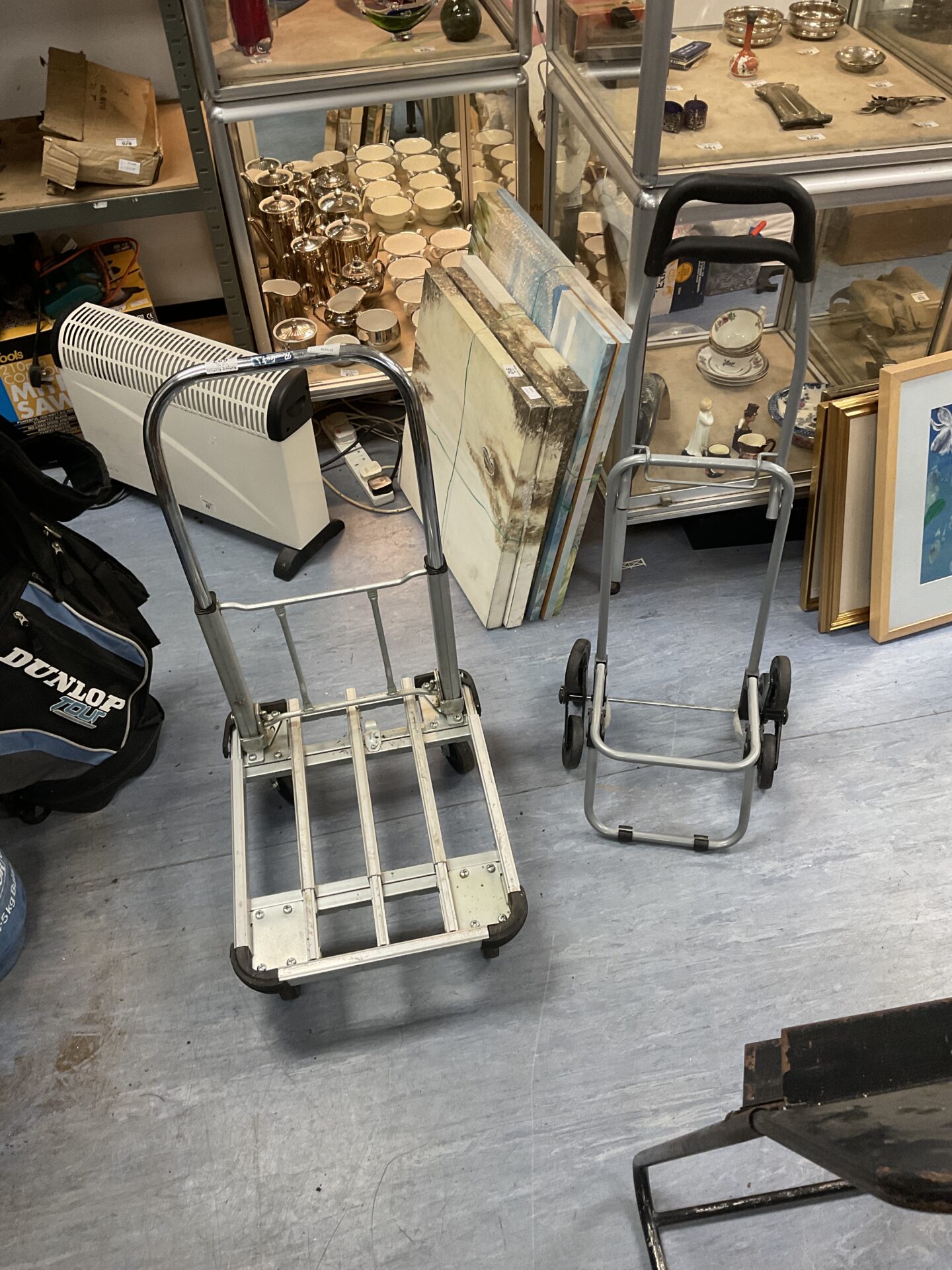 These are two folding trolleys, designed for light-duty transport and storage. Constructed from metal, these trolleys feature a collapsible design for easy storage when not in use. The trolleys have four wheels for maneuverability and a handle for pulling.