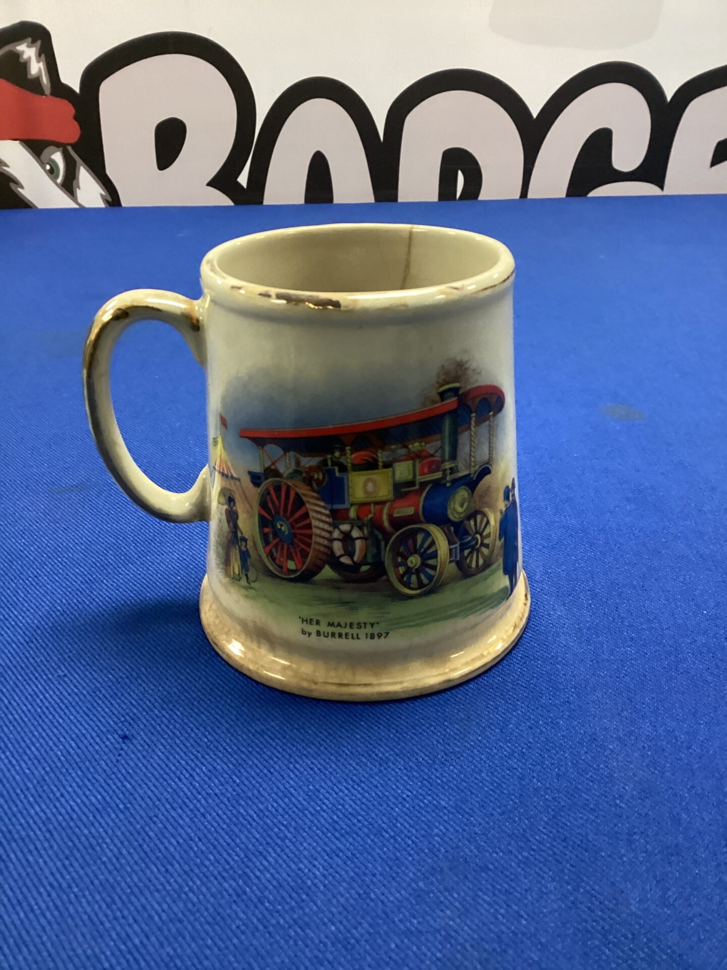 This mug exhibits signs of age and wear consistent with its vintage nature. There may be minor crazing to the glaze and slight wear to the painted decoration, adding to its character and authenticity. Despite these minor imperfections, the mug remains a delightful example of early 20th-century pottery and would be a welcome addition to any collection of vintage ceramics or steam roller memorabilia.