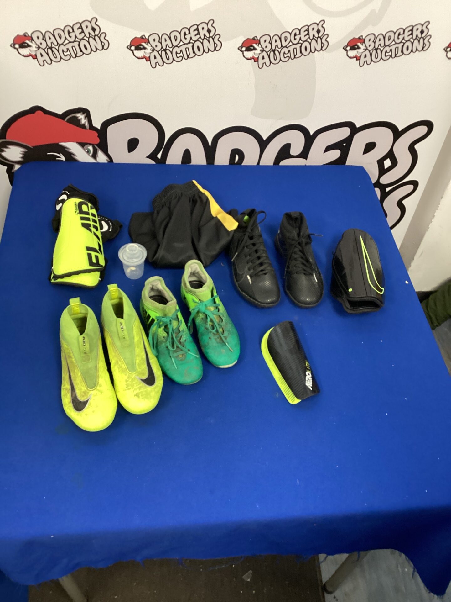 This lot comprises a pair of vibrant green Nike football boots, a set of shin pads, and a pair of black football shorts. The Nike boots feature a dynamic design, likely aimed at providing agility and support on the field. The inclusion of shin pads and shorts completes a basic kit for football players.