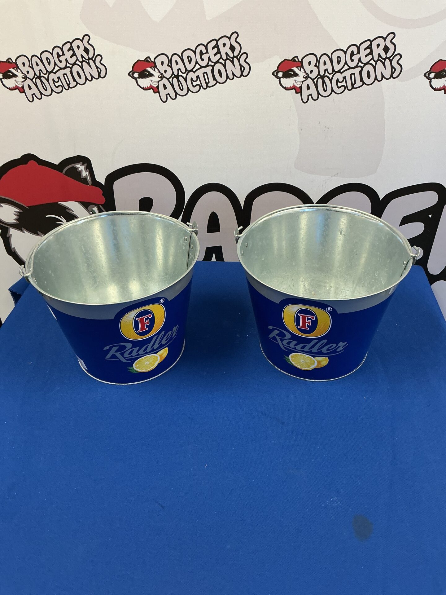 These are two metal ice buckets branded with the Fosters Lager logo. Constructed from polished metal, these buckets are designed to keep beverages chilled, perfect for entertaining or adding a touch of pub style to a home bar. The classic Fosters branding makes them instantly recognisable and a nod to a popular lager.