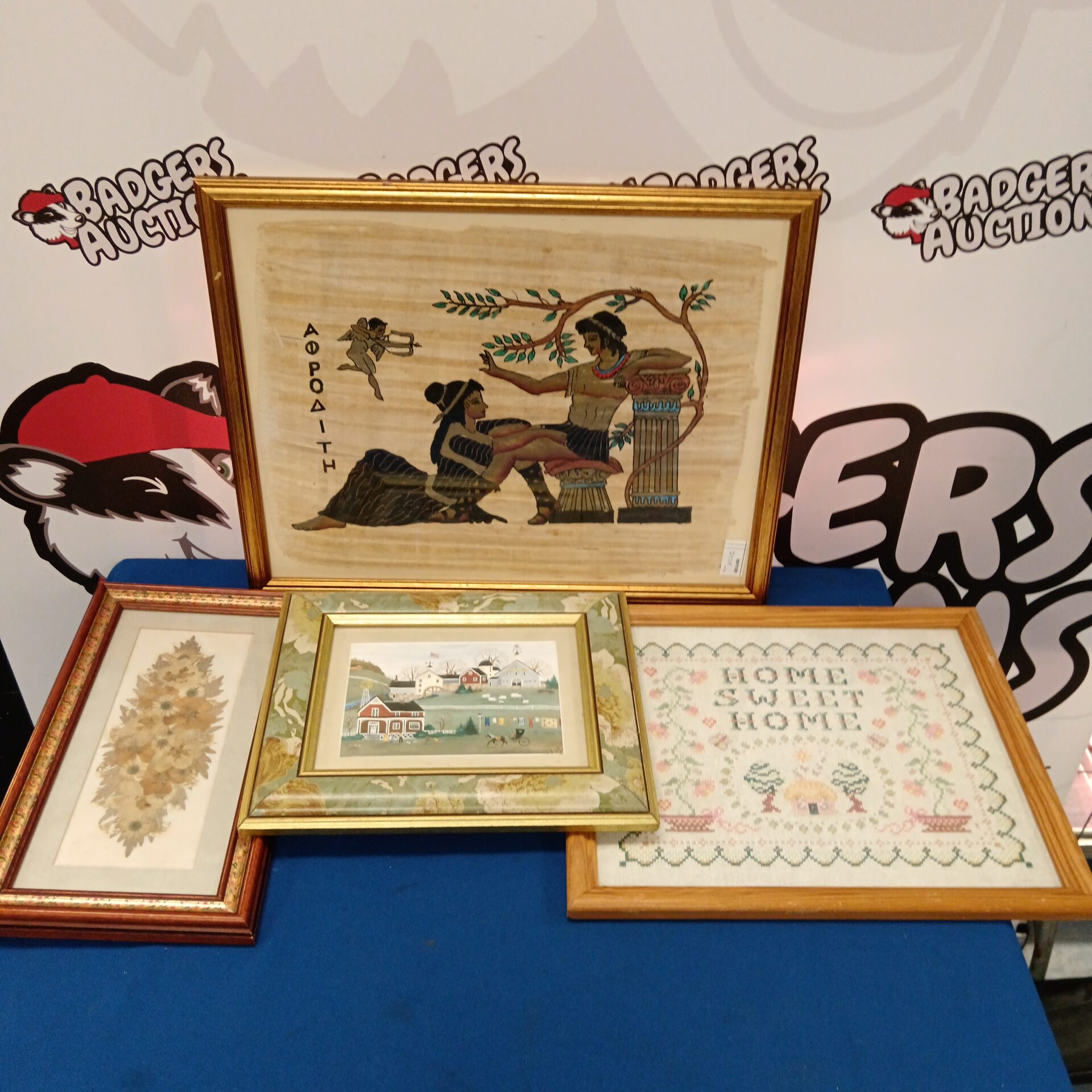 This lot comprises four framed art prints, including a striking oil painting on what appears to be Egyptian papyrus. The collection showcases a variety of styles, from the ancient Egyptian aesthetic to more traditional landscape and floral depictions. The prints are all presented behind glass within decorative frames, adding to their visual appeal and making them ready for display.