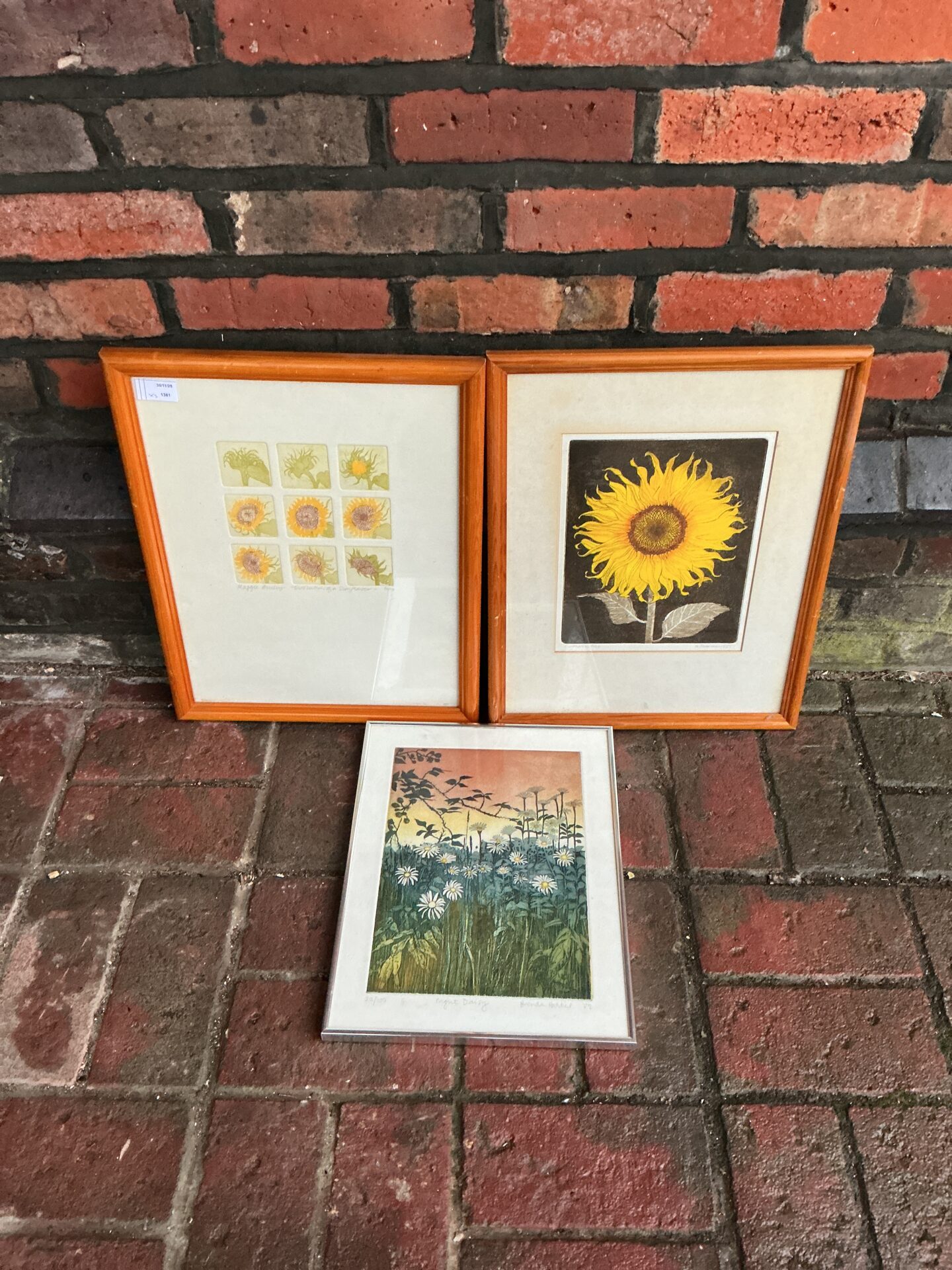 This lot comprises two framed sunflower prints alongside etching studies of flowers, including works by Brenda Hartue featuring night daisies. The prints showcase vibrant depictions of sunflowers, while the etchings offer a more delicate and detailed study of floral forms. These pieces represent a charming collection of botanical art, suitable for adding a touch of nature to any interior.