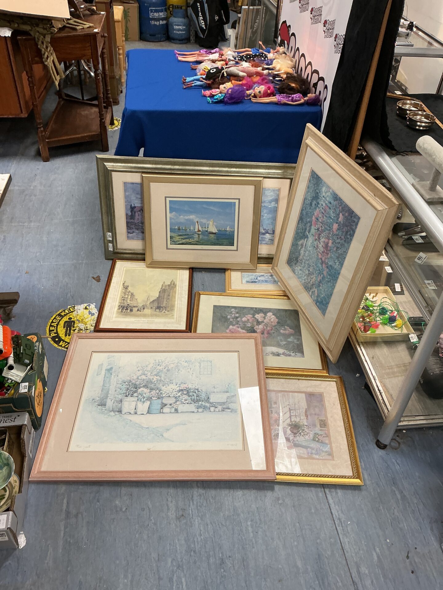 The prints show signs of age and wear, consistent with vintage items. Some frames may exhibit minor imperfections or damage. This lot would appeal to collectors of nautical art, vintage prints, or those seeking unique wall decor. The variety of prints allows for flexible display options.