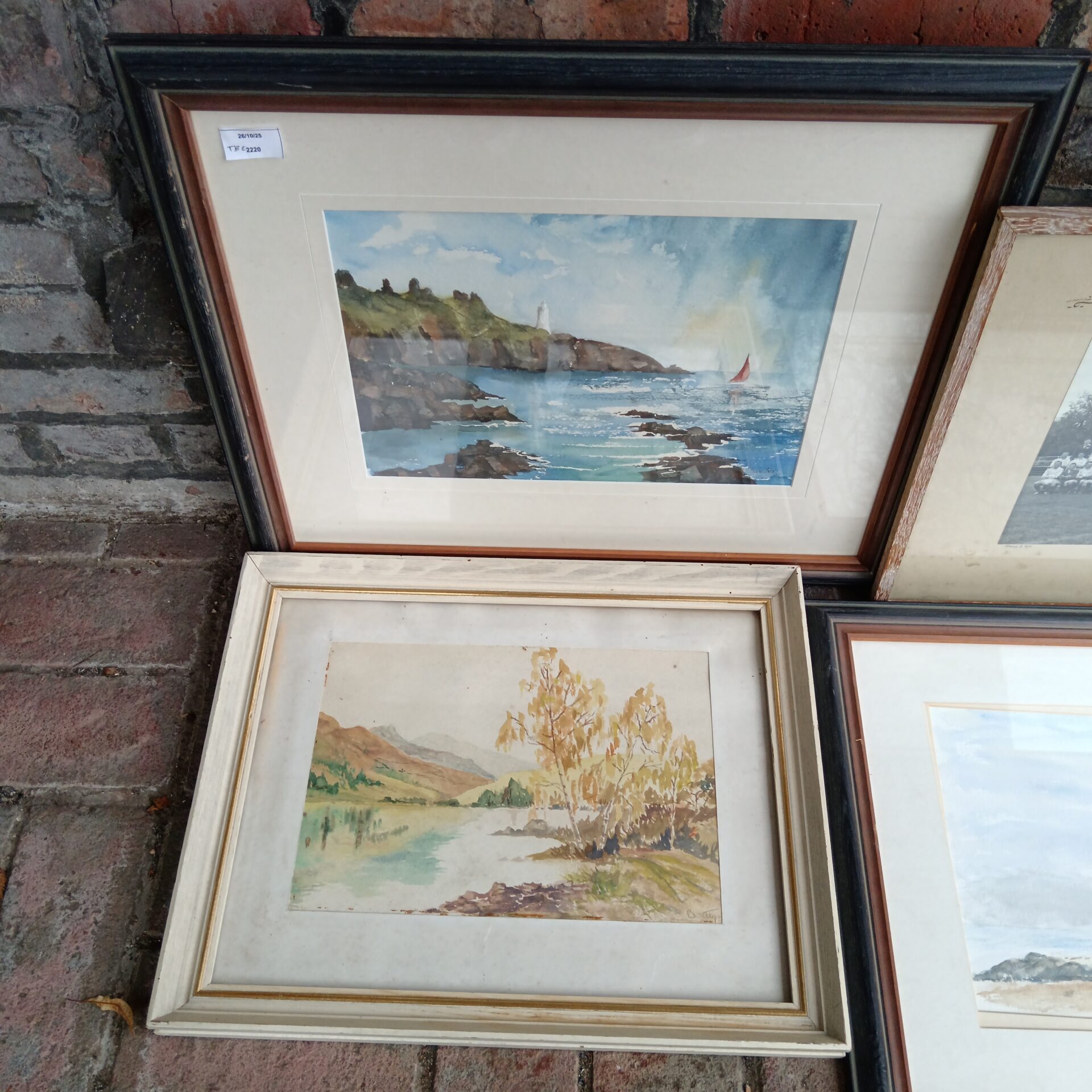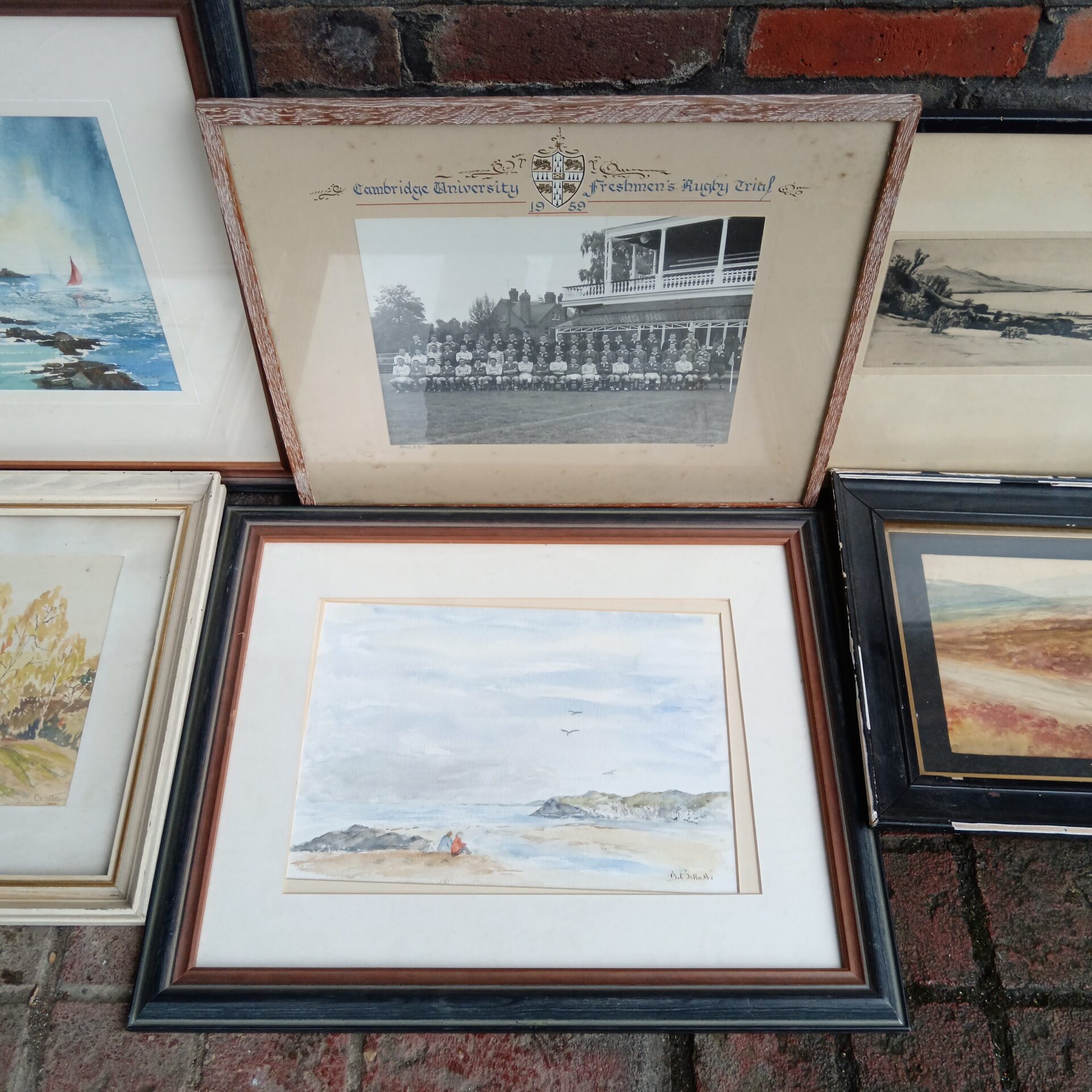 This lot comprises a collection of six framed watercolour paintings and a vintage print. The paintings depict various landscapes, including coastal scenes, fields, and trees, showcasing a range of artistic styles. One painting is signed “D Ballatti”, suggesting a known artist, while the print is a photograph of the 1959 Cambridge University Freshmen’s Rugby Trial team.