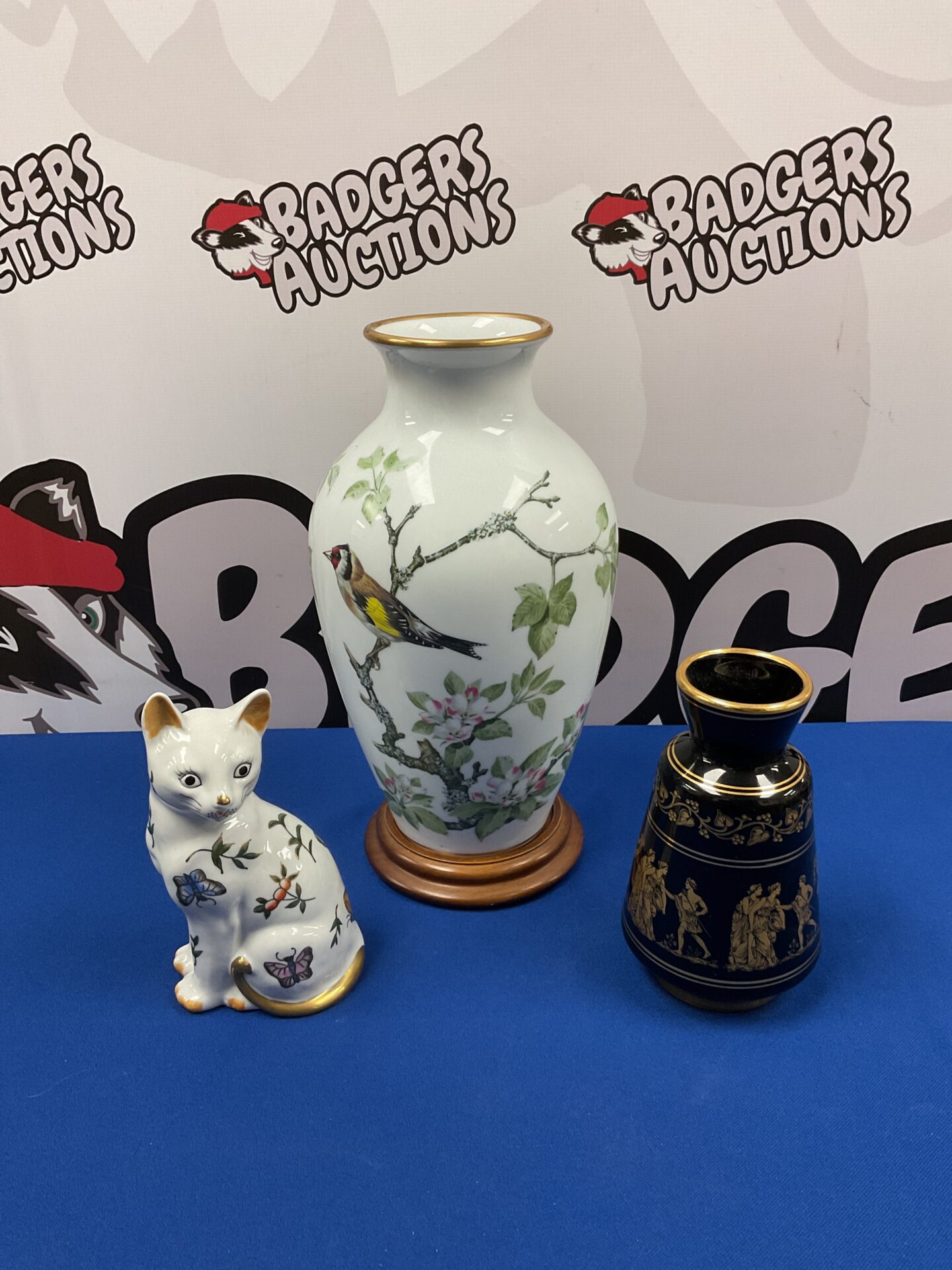 This is a beautiful Franklin Porcelain vase, decorated with a vibrant depiction of woodland birds amidst blossoming branches. The vase features a classic Japanese style, with a delicate form and intricate detailing. Accompanying the vase is a small porcelain cat figurine, signed on its base, adding to the collectible appeal of this lot.
