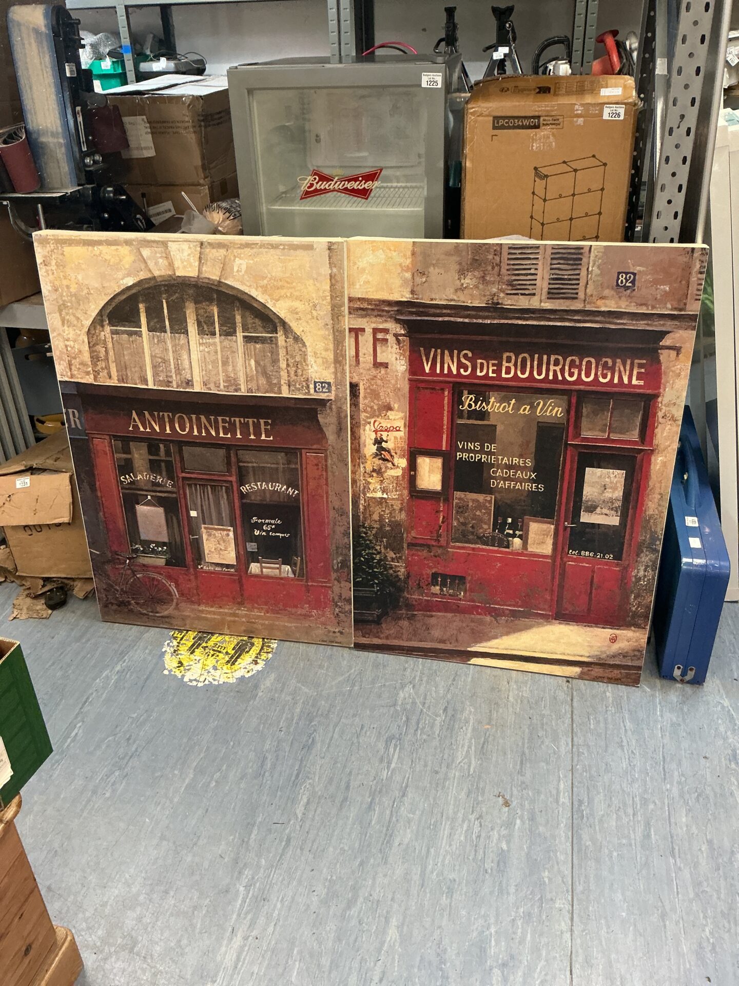 This lot comprises two large prints depicting charming French cafes. The prints evoke a classic bistro aesthetic, with detailed depictions of storefronts and signage. They are designed to bring a touch of Parisian ambiance to any space, and would suit a vintage or French country style interior.