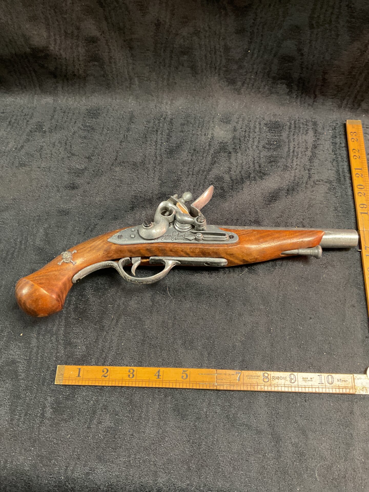 This reproduction pistol is presented in a display-worthy condition, showing the craftsmanship of its creation. While not an original antique, it offers a visually appealing representation of historical weaponry. This piece would be of interest to collectors of historical replicas, enthusiasts of pirate history, or those seeking a decorative item with a nautical or military theme.
