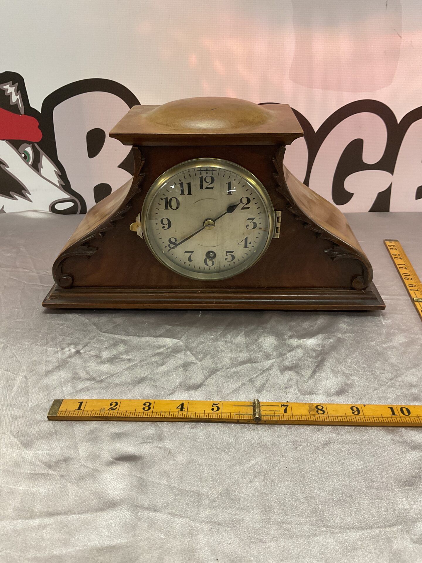 This clock presents with signs consistent with age and use. The mahogany case exhibits some wear and patina, adding to its character. Collectors and enthusiasts will appreciate the clock’s vintage charm and potential for restoration. It represents a piece of history and craftsmanship, offering a glimpse into a bygone era.