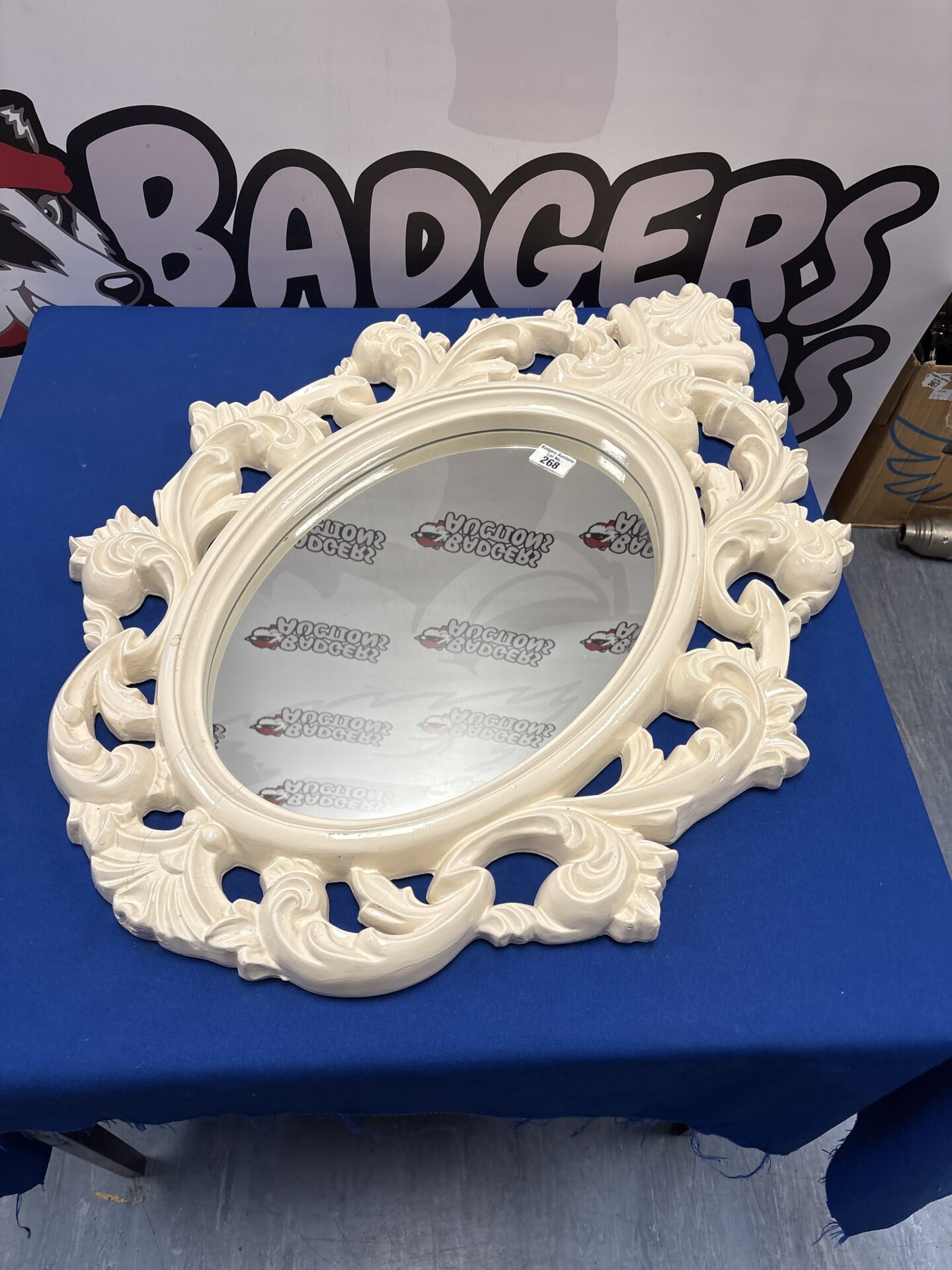 This is a decorative hall mirror, exhibiting a distinctly French style. The mirror features an ornate, heavily sculpted frame, likely constructed from a composition material or wood with applied ornamentation. The design incorporates floral motifs and scrolling foliage, typical of French Rococo or Baroque aesthetics. This mirror would have served as a focal point in a hallway or entranceway, adding a touch of elegance and grandeur to the space.