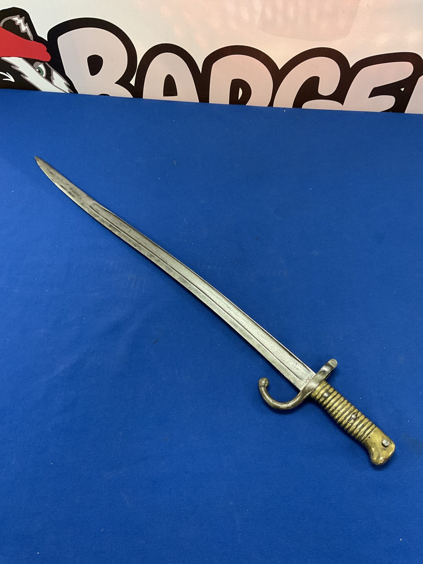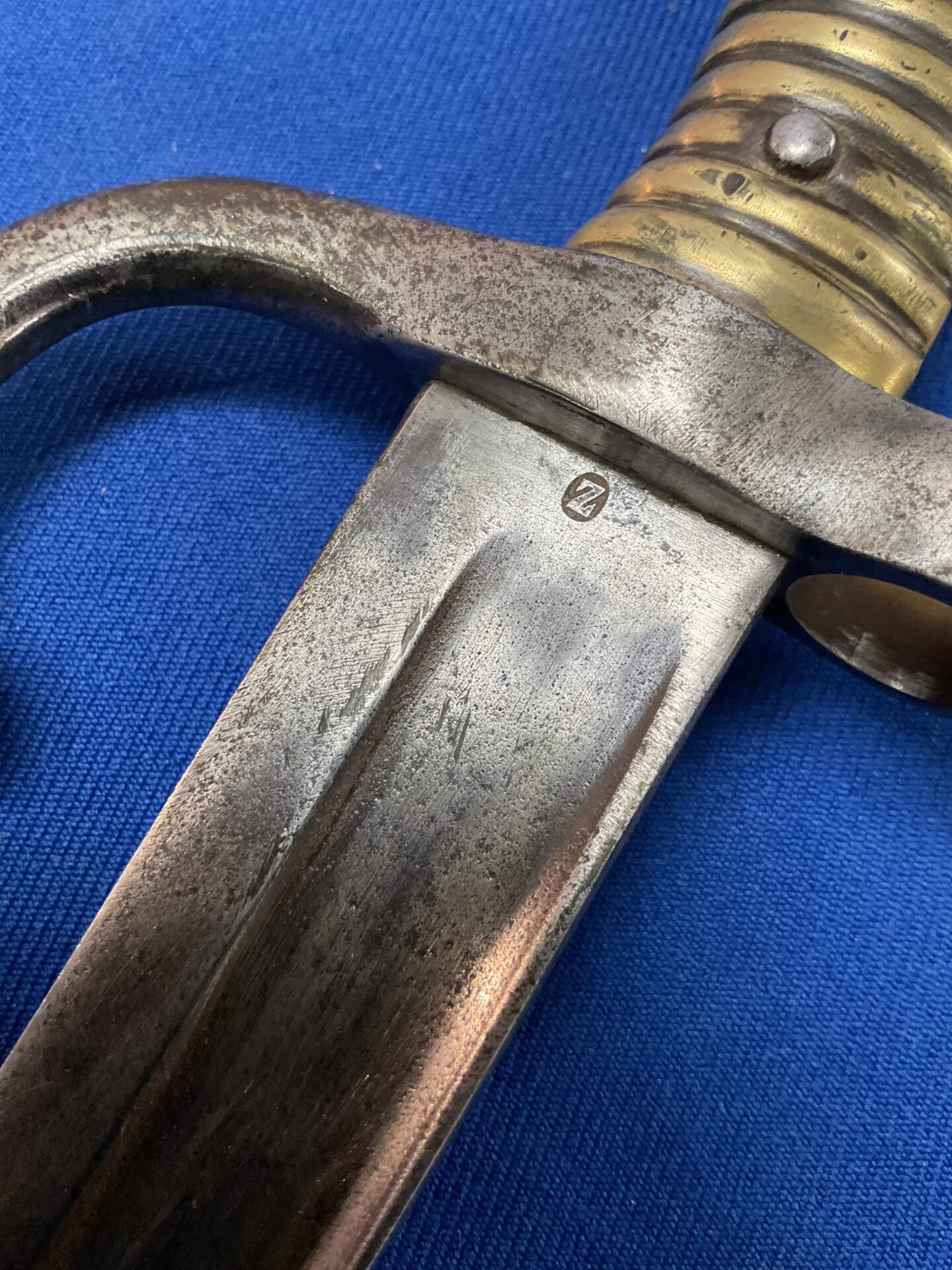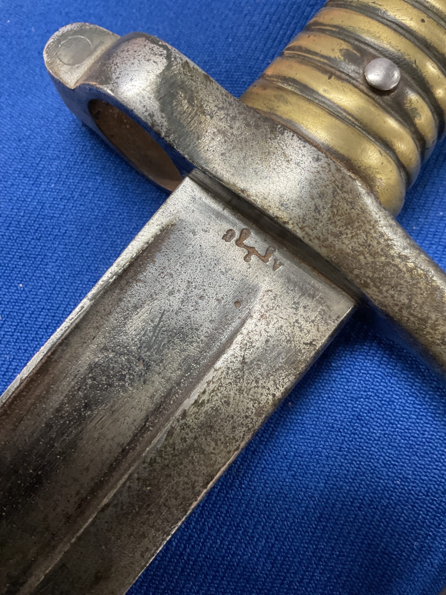 This bayonet shows signs of age and use, with patina and some surface wear consistent with its age. The blade retains a good shape, and the hilt is intact. This bayonet would be of interest to collectors of military antiques, French weaponry, or bayonets, offering a tangible piece of 19th-century military history.