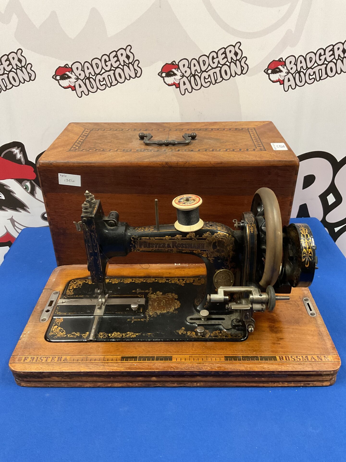 This is a beautiful antique Frister & Rossman hand crank sewing machine. This machine is a classic example of early 20th-century sewing technology, known for its robust construction and reliable performance. The machine features a distinctive hand crank mechanism, allowing for manual operation and precise control over the stitching process. It’s a wonderful piece of engineering and a testament to the craftsmanship of the era.