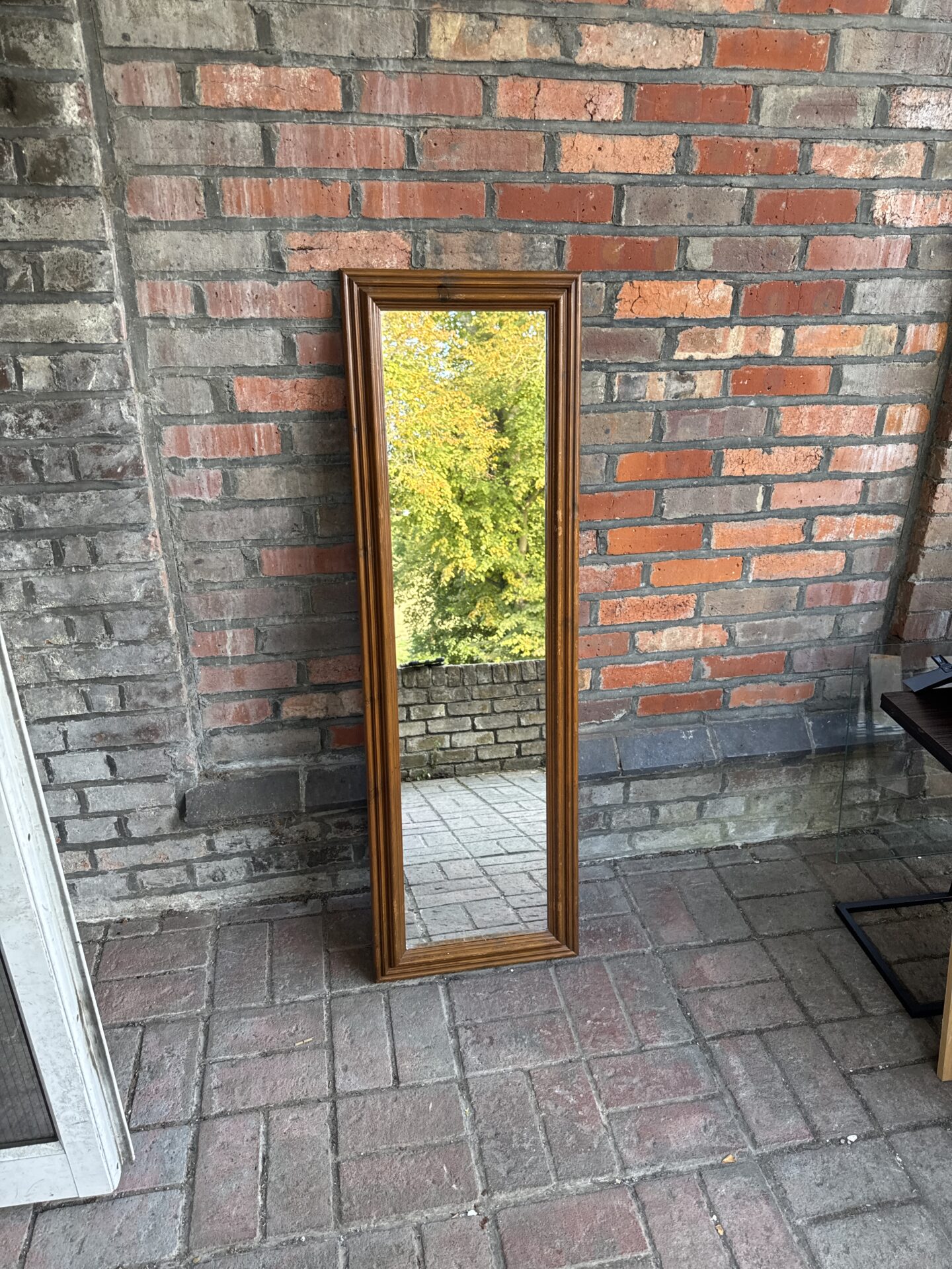 This is a beautiful, full-length mirror featuring a classic wooden frame. The warm wood tone adds a touch of sophistication and would complement a variety of interior styles, from traditional to contemporary. Its generous size makes it ideal for full-body reflections, perfect for bedrooms, dressing rooms, or hallways. The mirror is designed to be wall-mounted, offering a clean and space-saving display.