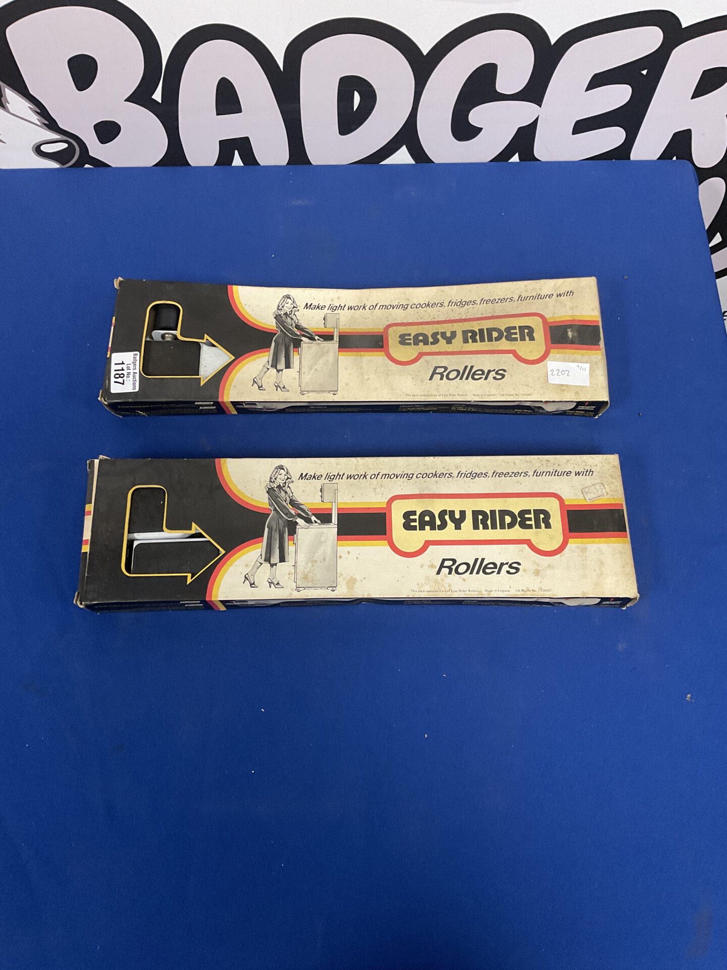 These are a pair of vintage Easy Rider furniture rollers, designed to assist with the movement of heavy items around the home. The rollers are constructed from a durable plastic and are intended to slide under furniture legs, allowing for easy repositioning. These rollers were originally sold as a set of two pairs, and are a practical solution for moving appliances, furniture, or other bulky objects without causing damage to floors or strain to the user.