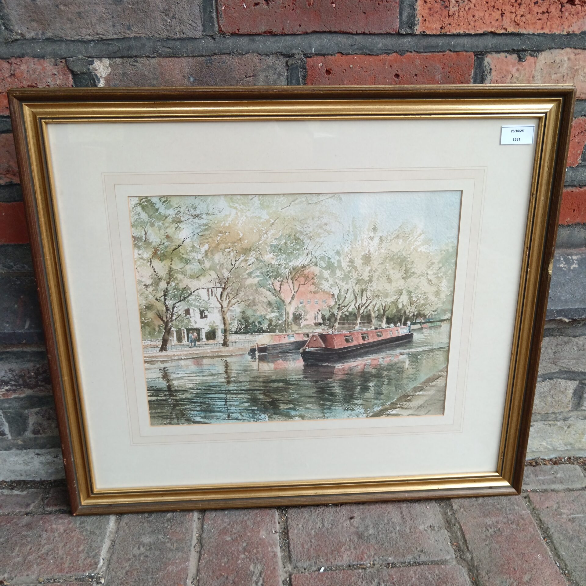 This is a charming watercolour painting by G M Lambert, depicting a tranquil canal scene with a traditional narrowboat. The artwork showcases a picturesque townscape in the background, with trees lining the canal bank. Lambert’s style is characterised by delicate brushwork and a soft colour palette, capturing the peaceful atmosphere of the British waterways. The painting is beautifully presented within a decorative gilt frame, enhancing its visual appeal.