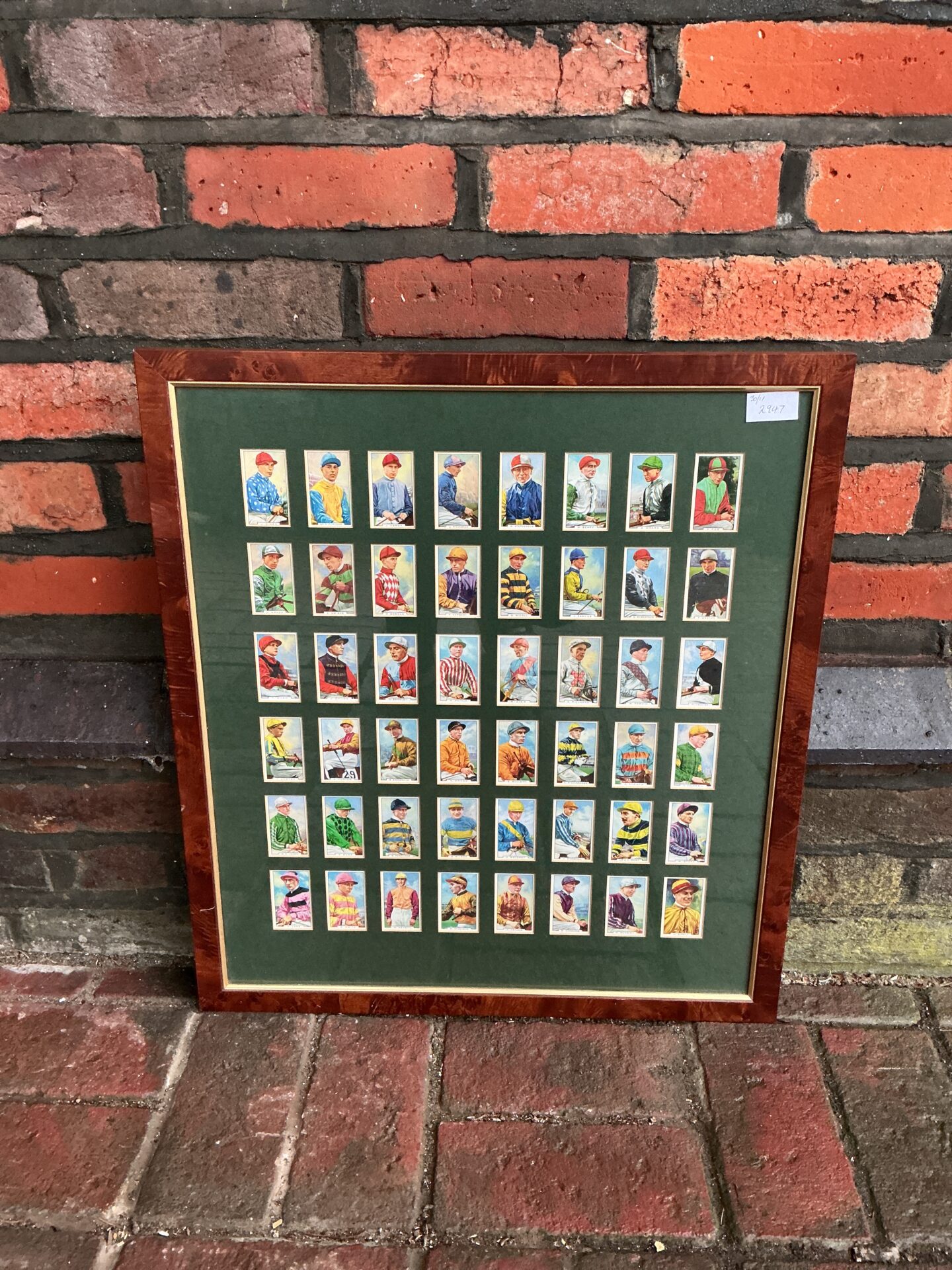 A framed collection of original Gallaher Ltd famous jockey cigarette cards. These vintage cards depict jockeys in colourful racing silks, offering a charming piece of sporting history. Ideal for collectors of ephemera, sporting memorabilia, or vintage cigarette cards.