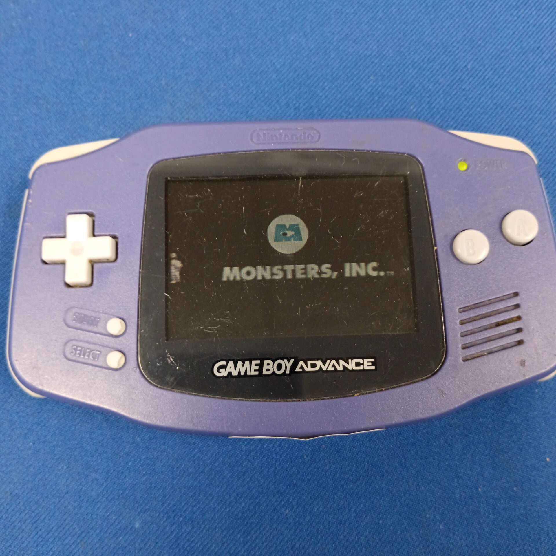 This Game Boy Advance console shows signs of previous use and wear. The screen exhibits some scratches and marks, and the console casing has some minor scuffs and discolouration. The included game cartridges show wear to their labels and casings. This console and games may be of interest to collectors of retro gaming memorabilia, or those looking to revisit classic Game Boy Advance titles.