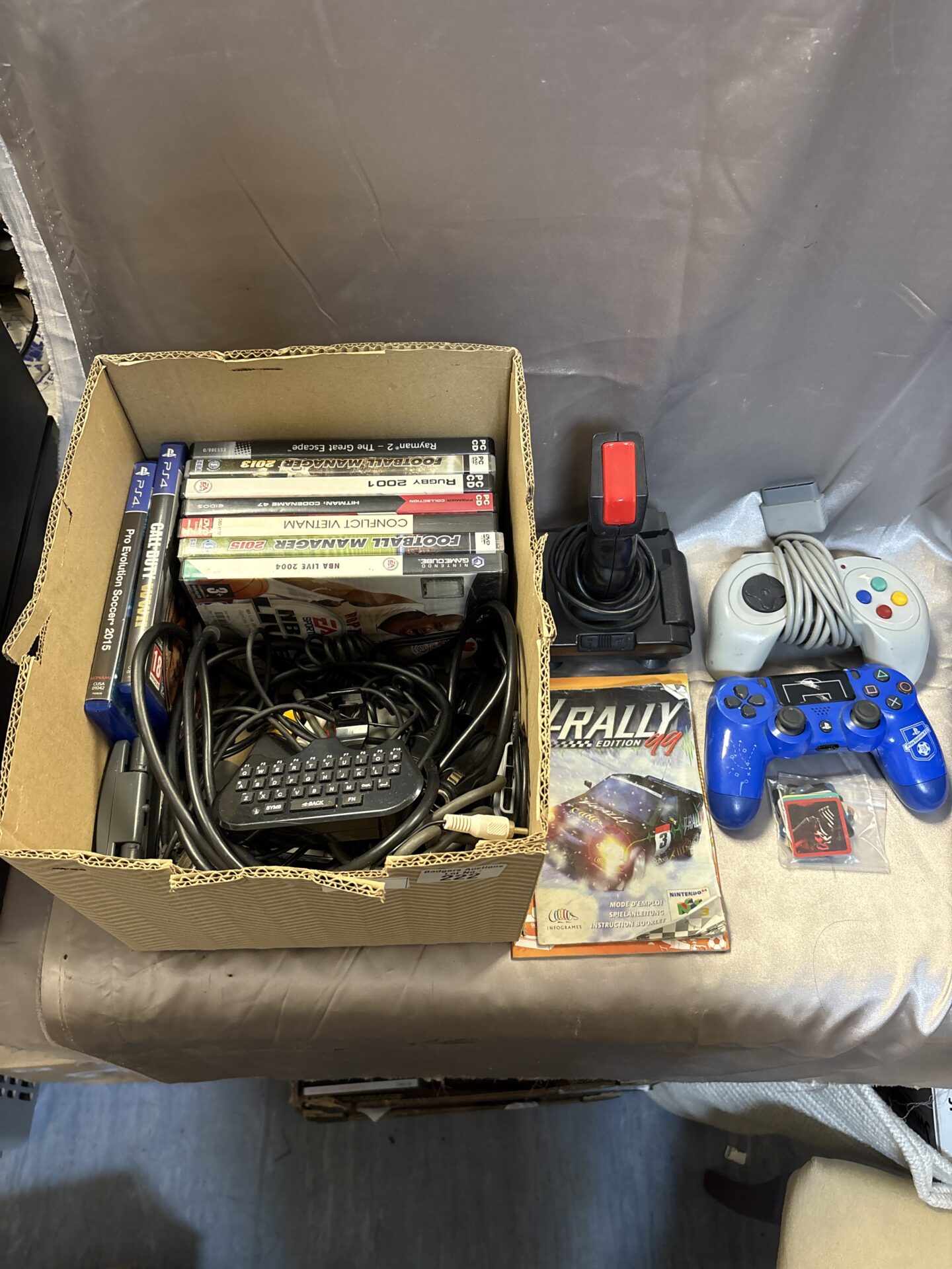 This lot comprises a collection of gaming-related items, including what appears to be PlayStation and PC games, various controllers, and power supplies potentially for consoles. The bundle offers a mix of hardware and software, catering to both retro and modern gaming enthusiasts. The assortment suggests a varied gaming experience, with potential for both single-player and multiplayer enjoyment.