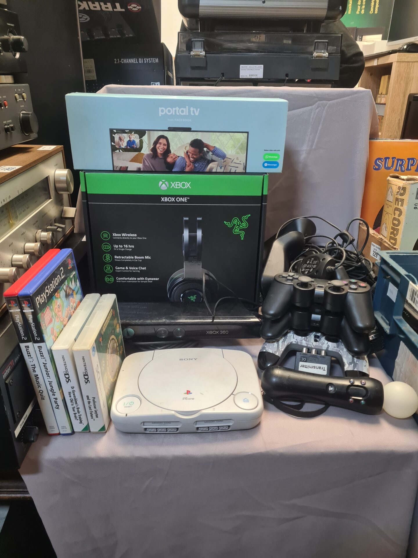 This lot comprises a selection of gaming consoles and accessories. Included is a Sony PlayStation 1 Slim console, an Xbox One Razer headset, a collection of PlayStation 2 games, and a Nintendo DS handheld console. This bundle offers a variety of gaming experiences from different eras, appealing to both retro enthusiasts and modern gamers.