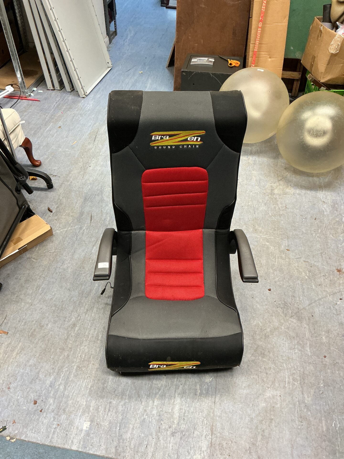 This is a Brazen sound chair, designed for immersive gaming experiences. The chair features integrated audio, providing a surround sound experience directly to the user. Its ergonomic design aims to provide comfort during extended gaming sessions, with a focus on supporting posture and reducing strain.