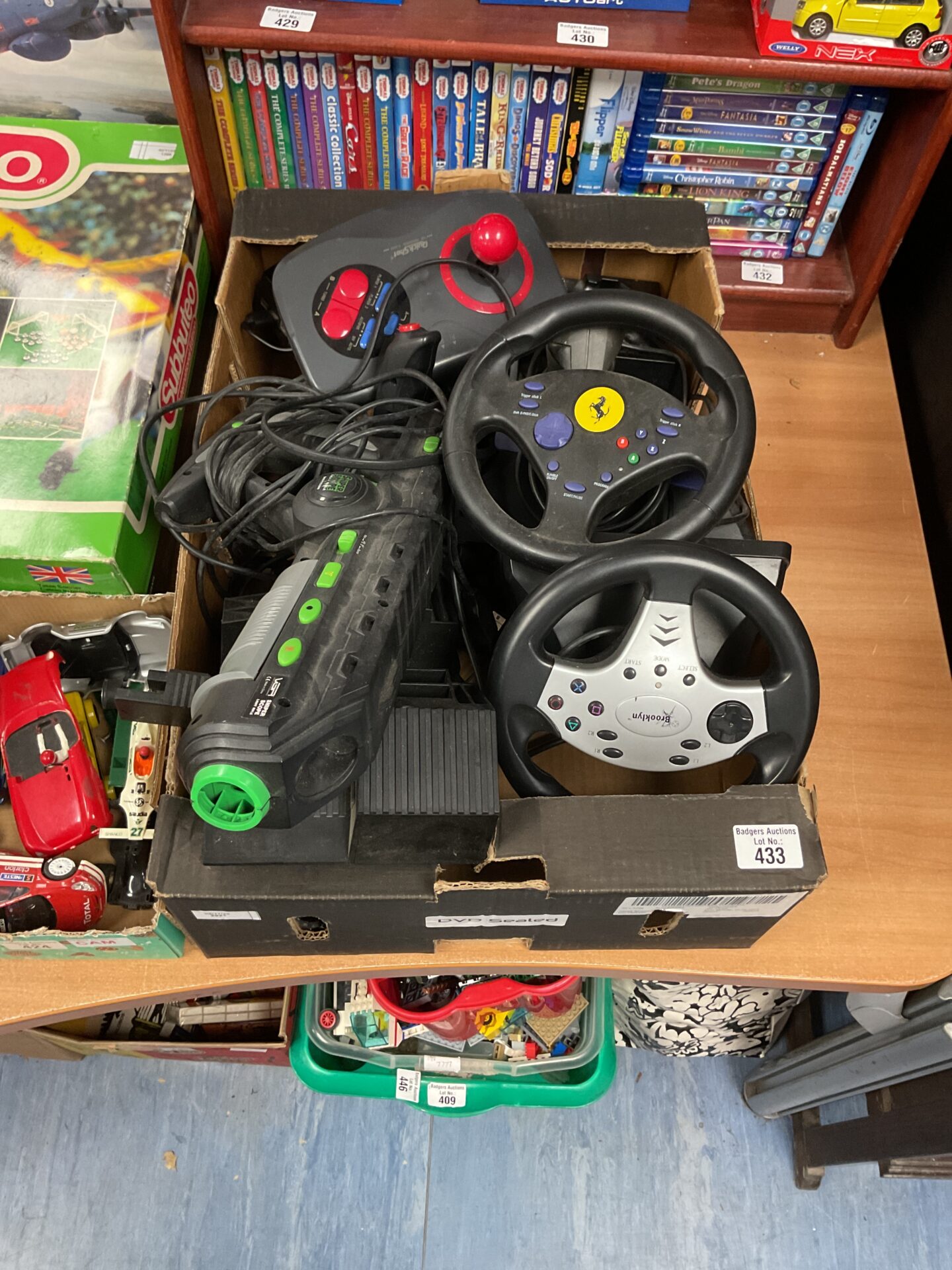 The condition of the steering wheels appears varied, with some showing signs of use and wear. This lot would be of interest to collectors of gaming peripherals, enthusiasts of racing games, or those looking for vintage gaming accessories. The collection offers a glimpse into the evolution of gaming control technology.