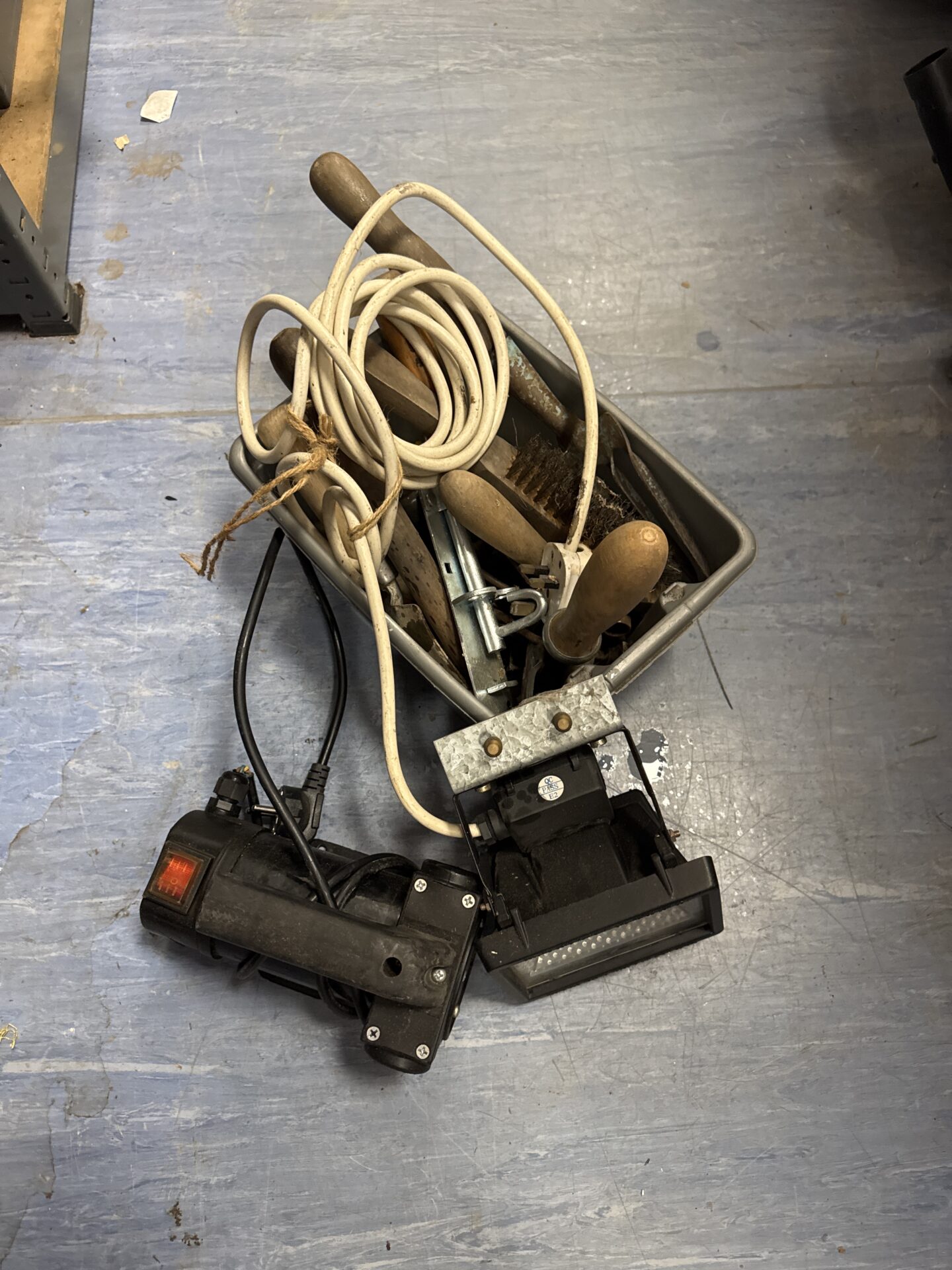 This lot comprises a collection of miscellaneous automotive parts and workshop tools, seemingly from a garage clear-out. The contents include what appears to be a vehicle light assembly, a length of electrical cable, and a small metal bracket. The assortment suggests a potential origin from vehicle maintenance or repair, offering a glimpse into a mechanic’s or enthusiast’s workspace.