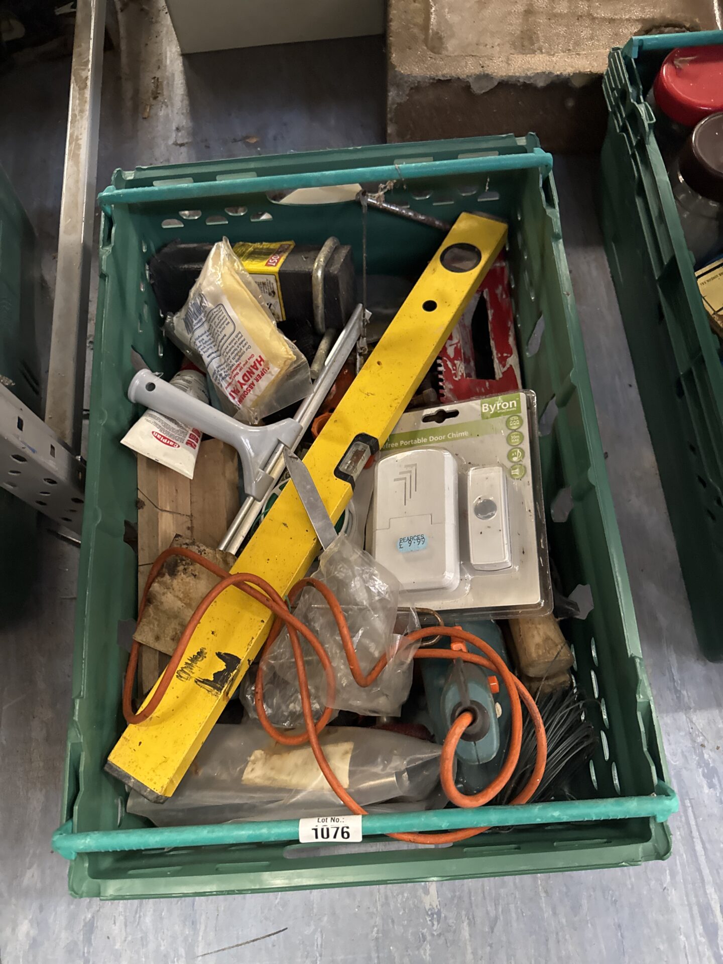 This lot contains a collection of assorted tools and hardware items, seemingly from a garage or workshop clearance. The contents include a selection of hand tools, a length of electrical cable, and various fixings. The items appear to be a mix of different ages and types, suggesting a long period of accumulation.