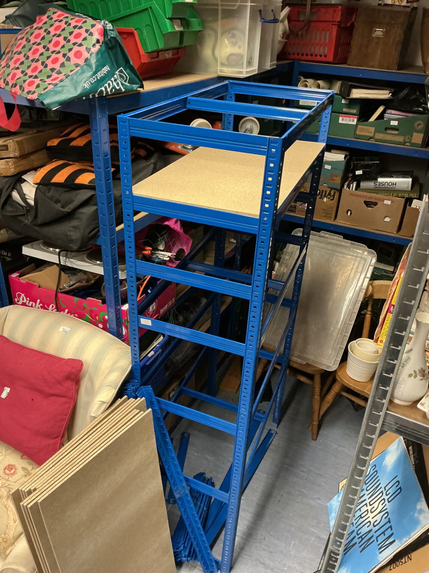 This heavy-duty metal garage racking unit offers robust storage for workshops, garages, and more. Featuring multiple tiers and an open design, it provides easy access to tools and equipment. This unit shows signs of previous use and is offered in its original condition.