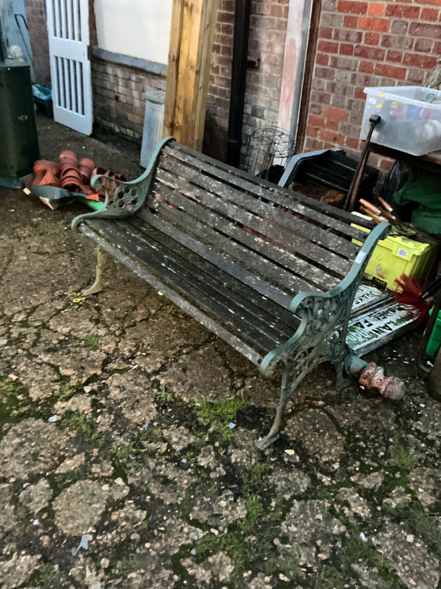 The bench exhibits signs of age and weathering, consistent with its outdoor exposure. The metalwork shows some surface rust and patina, while the wooden slats may exhibit wear, cracks, or fading. Despite these imperfections, the bench retains its structural integrity and character. Collectors and garden enthusiasts may appreciate its vintage charm and potential for restoration or repurposing.