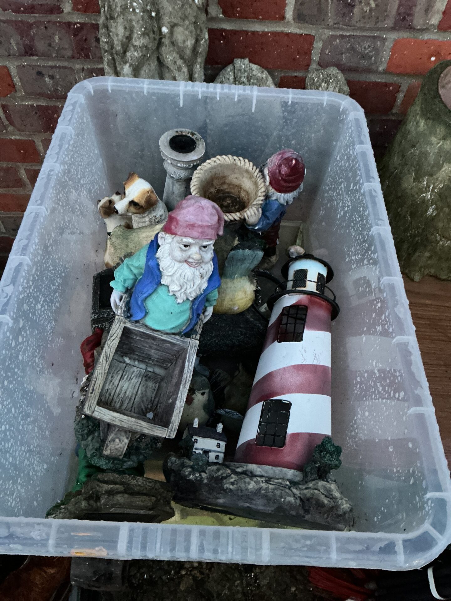 This lot comprises a collection of various garden ornaments, including several gnomes and a lighthouse figurine. The ornaments appear to be crafted from resin or a similar composite material, designed to withstand outdoor conditions. The collection offers a whimsical touch to any garden space, with each piece exhibiting unique detailing and character.