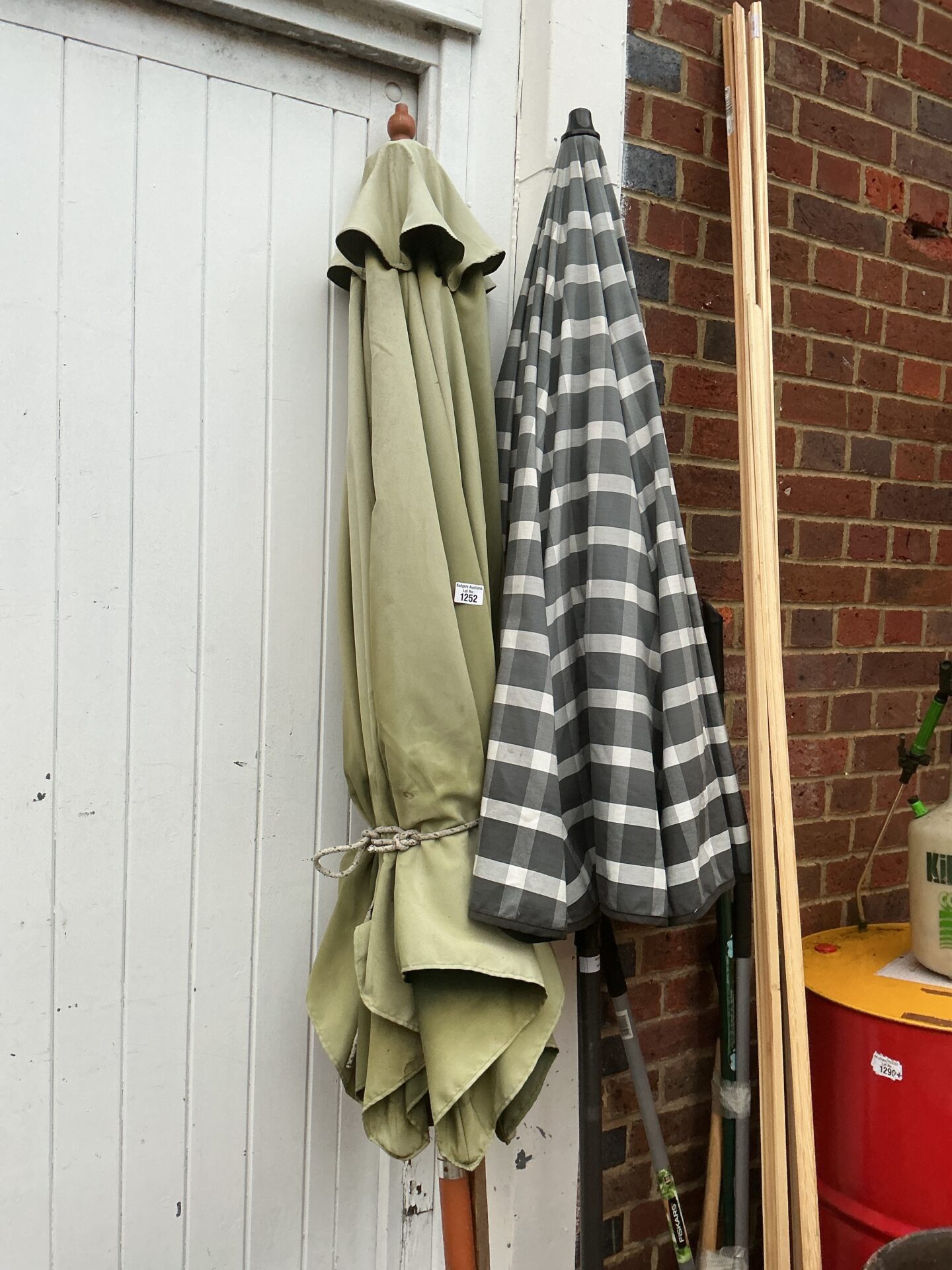 This lot comprises two garden parasols, one in a green striped pattern and the other in a black and white check. These parasols are designed to provide shade in outdoor spaces such as gardens, patios, or decks. The construction appears to be of a traditional style, with fabric canopies supported by metal frames, intended for use with a pole stand (not included).