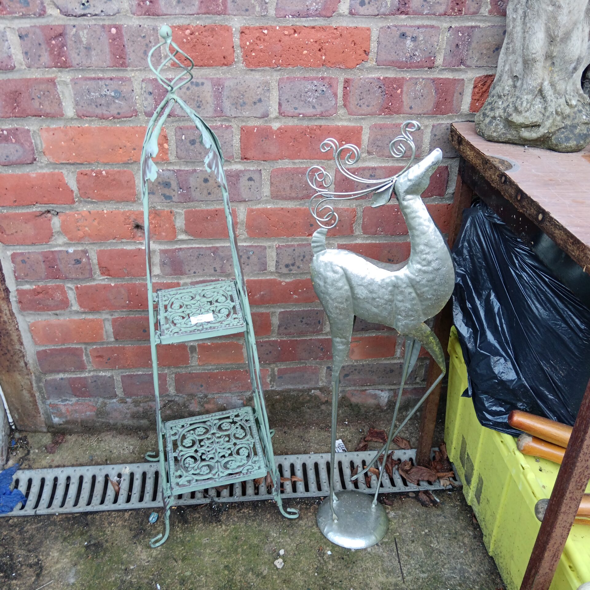 This lot comprises a decorative metal garden pot stand and a metal deer garden ornament. The stand features a scrolling design and is intended to elevate a potted plant, adding visual interest to a garden or patio. The deer ornament is a charming addition, offering a whimsical touch to the outdoor space. Both pieces appear to be constructed from metal, likely wrought iron, and exhibit a weathered aesthetic.